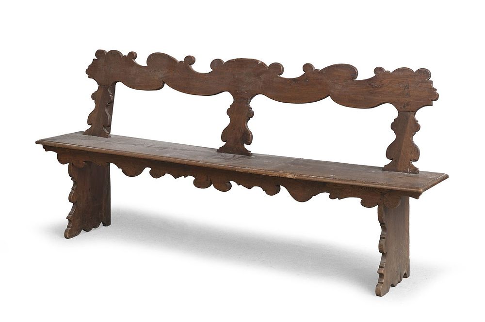 Faldistorio in ferro battuto, con braccioli a volute. Schienale con pomoli in bronzo dorato, appoggi in cuoio coevi.