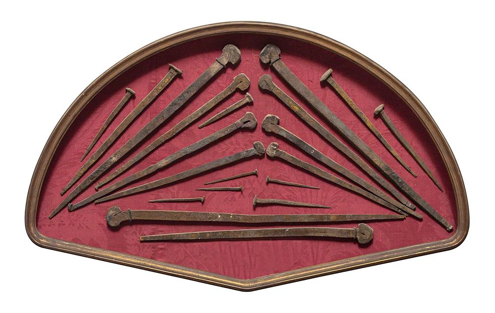 Faldistorio in ferro battuto, con braccioli a volute. Schienale con pomoli in bronzo dorato, appoggi in cuoio coevi.