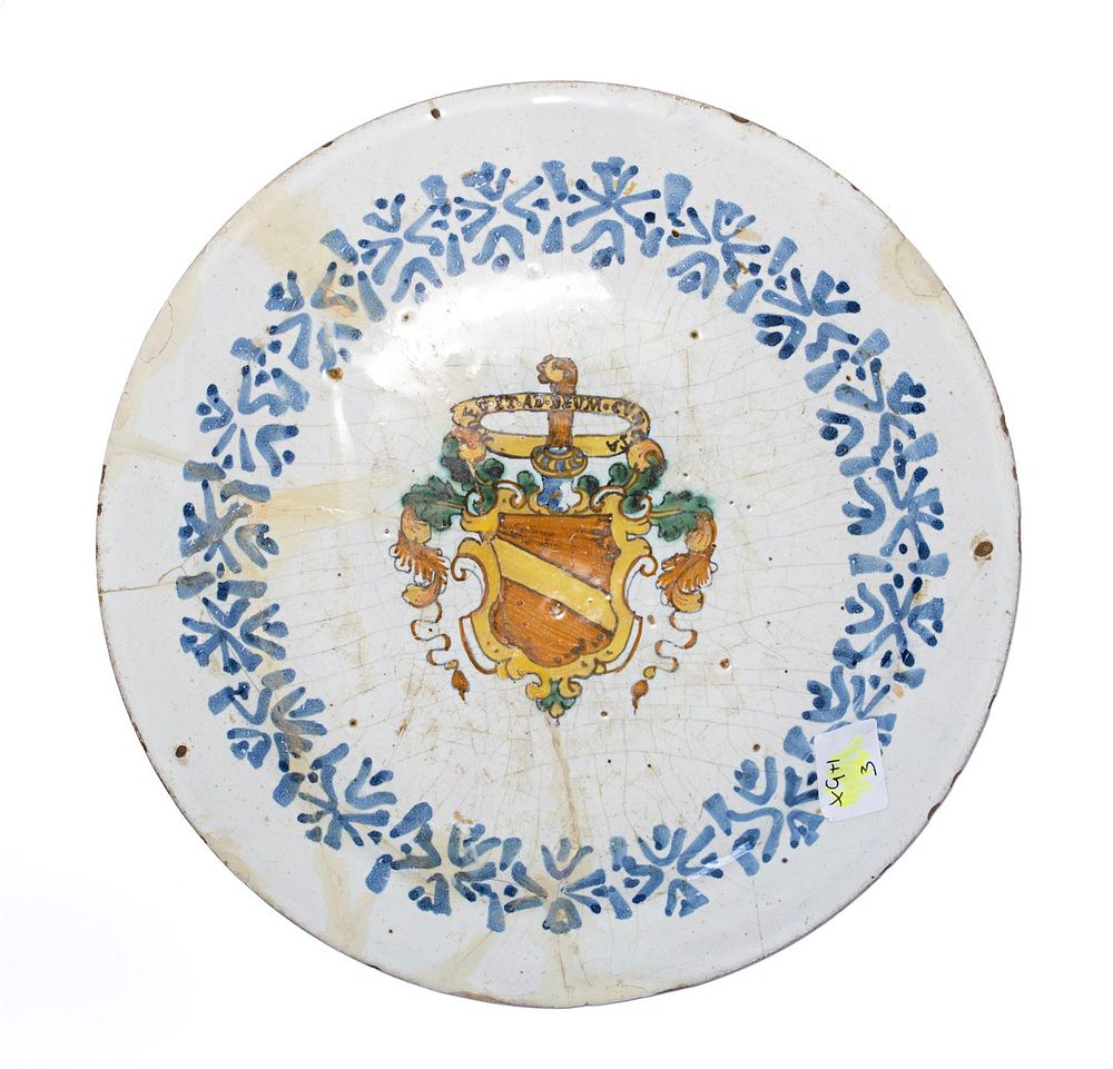 a smalto bianco e blu con decoro a motivi vegetali, fiere e case. Retro decorato a stemma di Casata con riserva a ghirlanda.