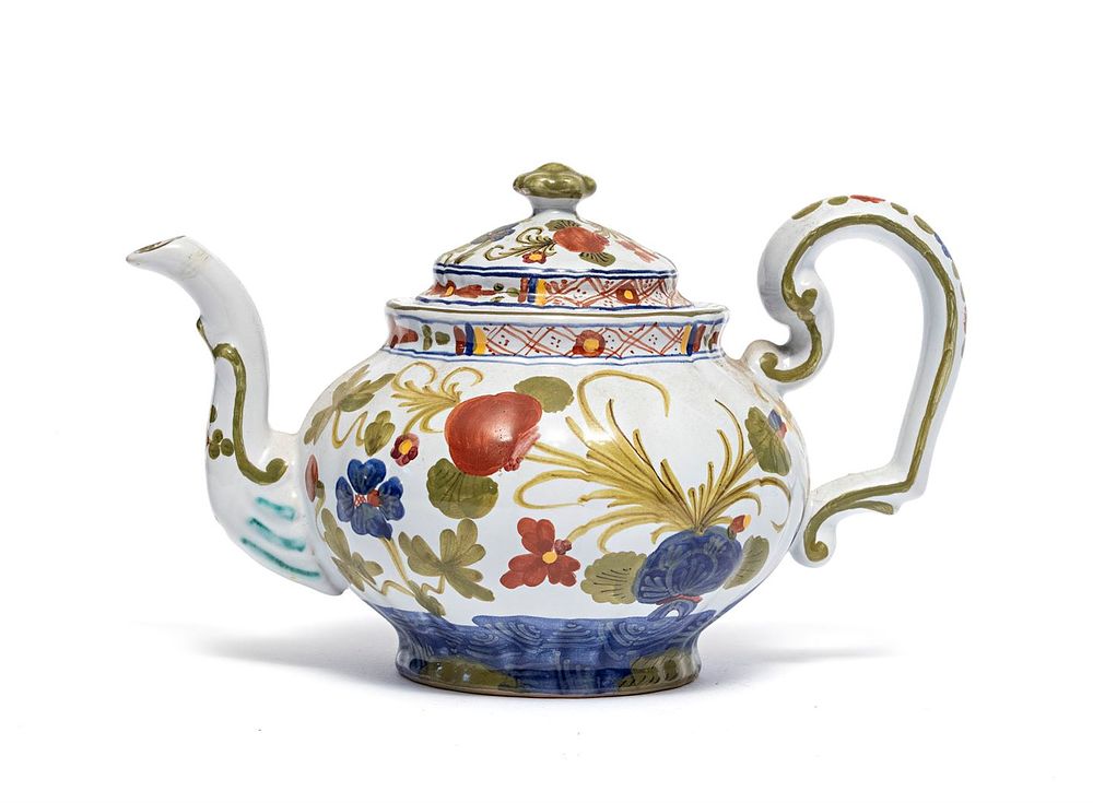 a smalti policromi, con decori a fiori e riserva in arancio e bordo in blu.