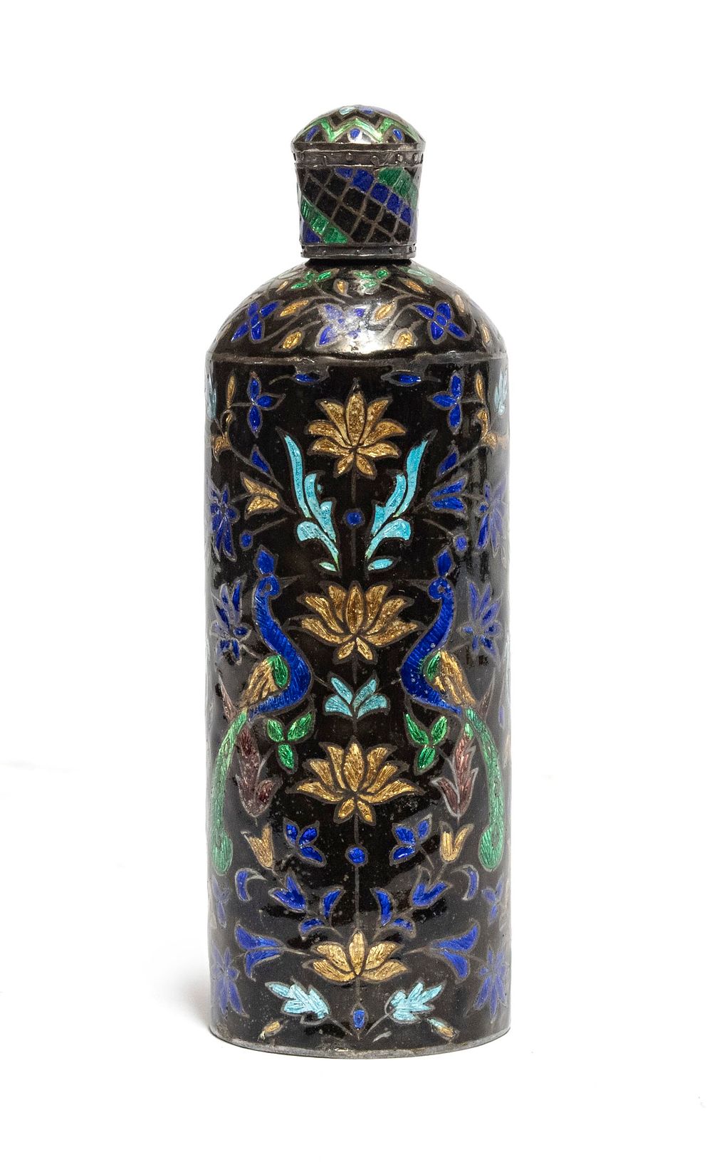 a smalti policromi e oro, con riserve raffiguranti scena cavalleresca e allegoria classica. Manici a bastoncello con finiture a smalto verde, decorati a palmette, desinenze a teste di arieti. Zoccolo quadrato a smalto nero.
