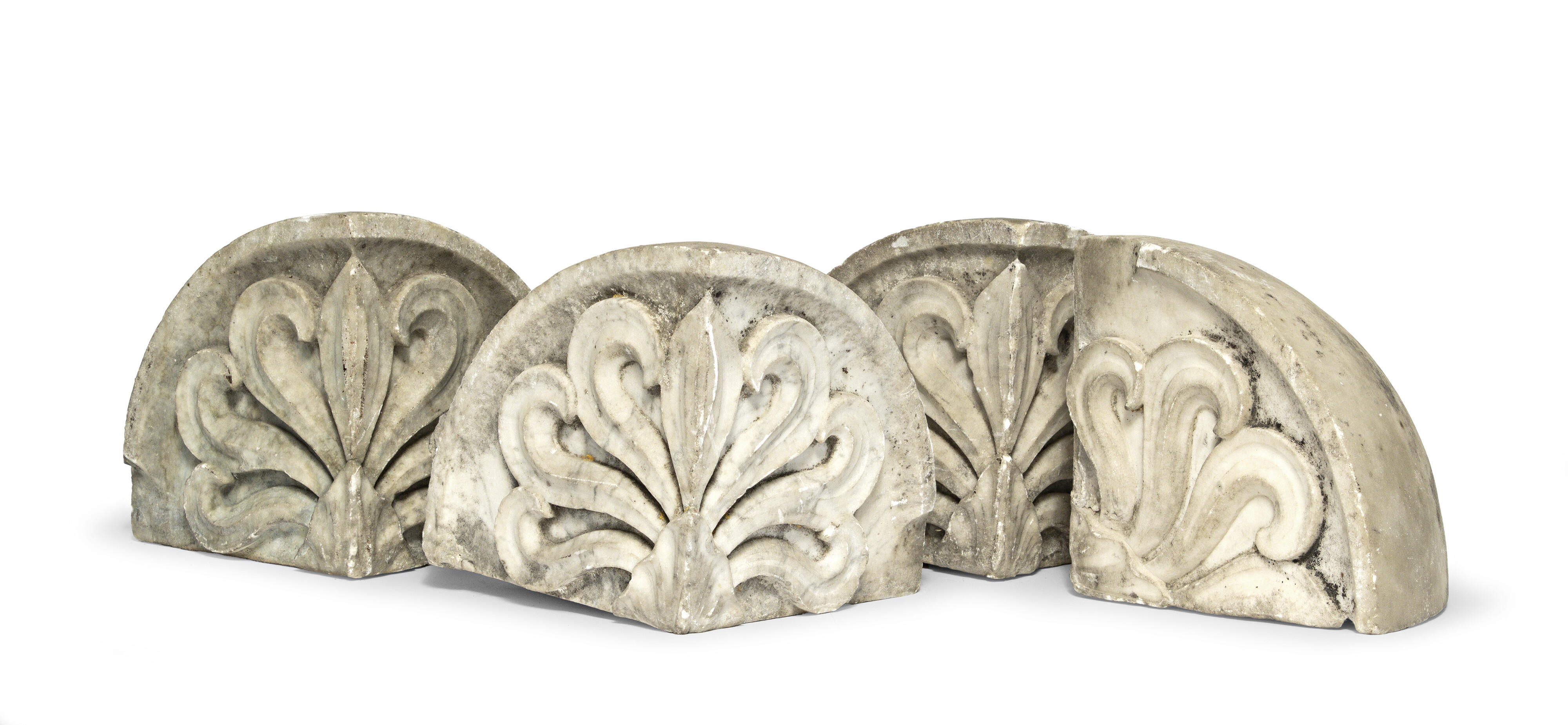 QUATTRO ELEMENTI MARMO TOSCANA XVII SECOLO Quattro elementi angolari in marmo, con decorazioni a rilievo raffiguranti volute. Toscana, XVII secolo. Misure cm. 18 x 18.