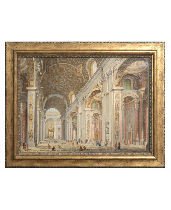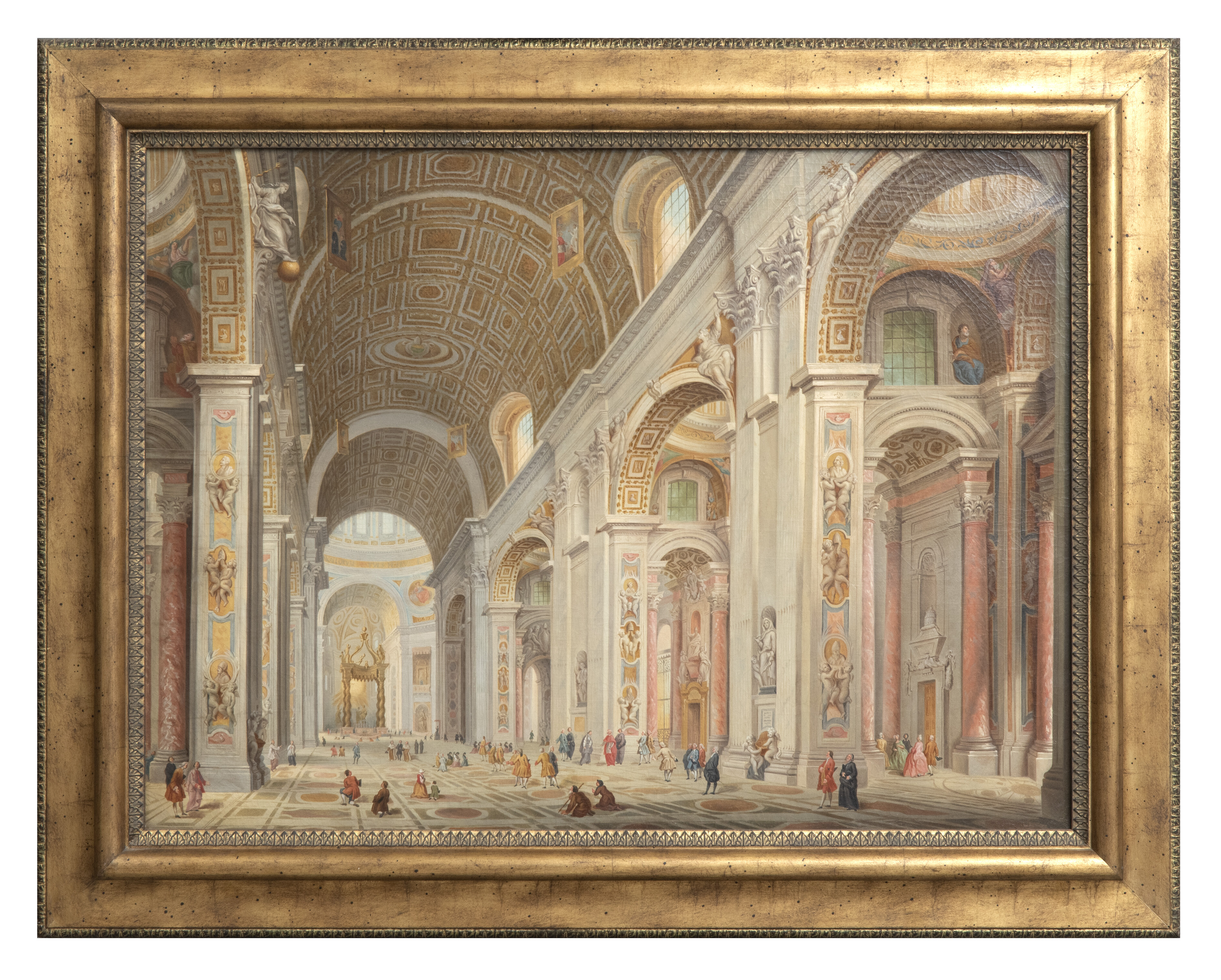 FRANCESCO PANINI (Roma 1745 - 1812) INTERNO DELLA BASILICA DI SAN PIETRO Olio su tela, cm. 75 x 100 Cornice dorata PROVENIENZA Asta Christie's Roma del 21/11/1995 Famiglia romana CONDITION REPORT Rintelo recente. Non si notano restauri di spicco sulla superficie pittorica