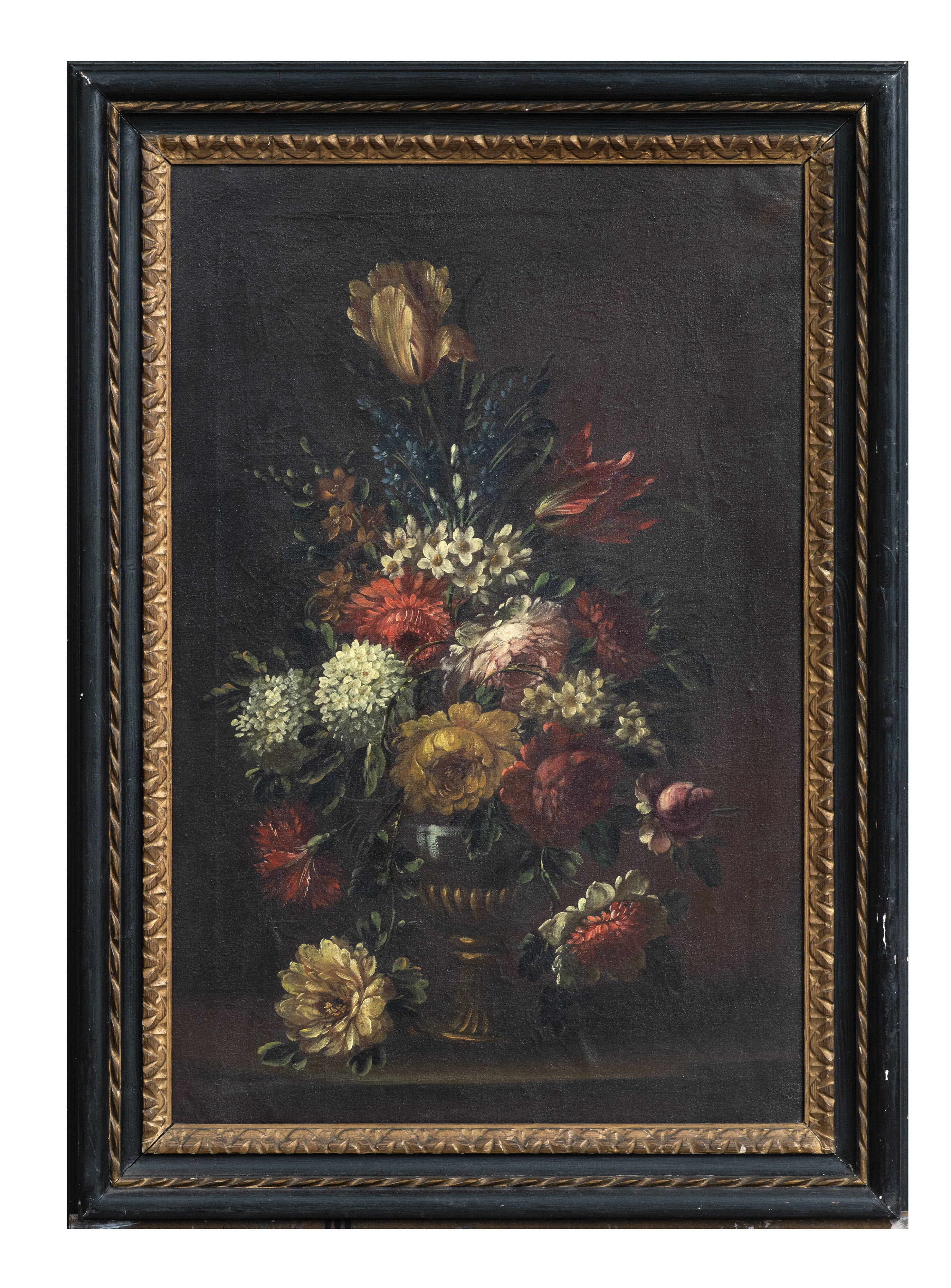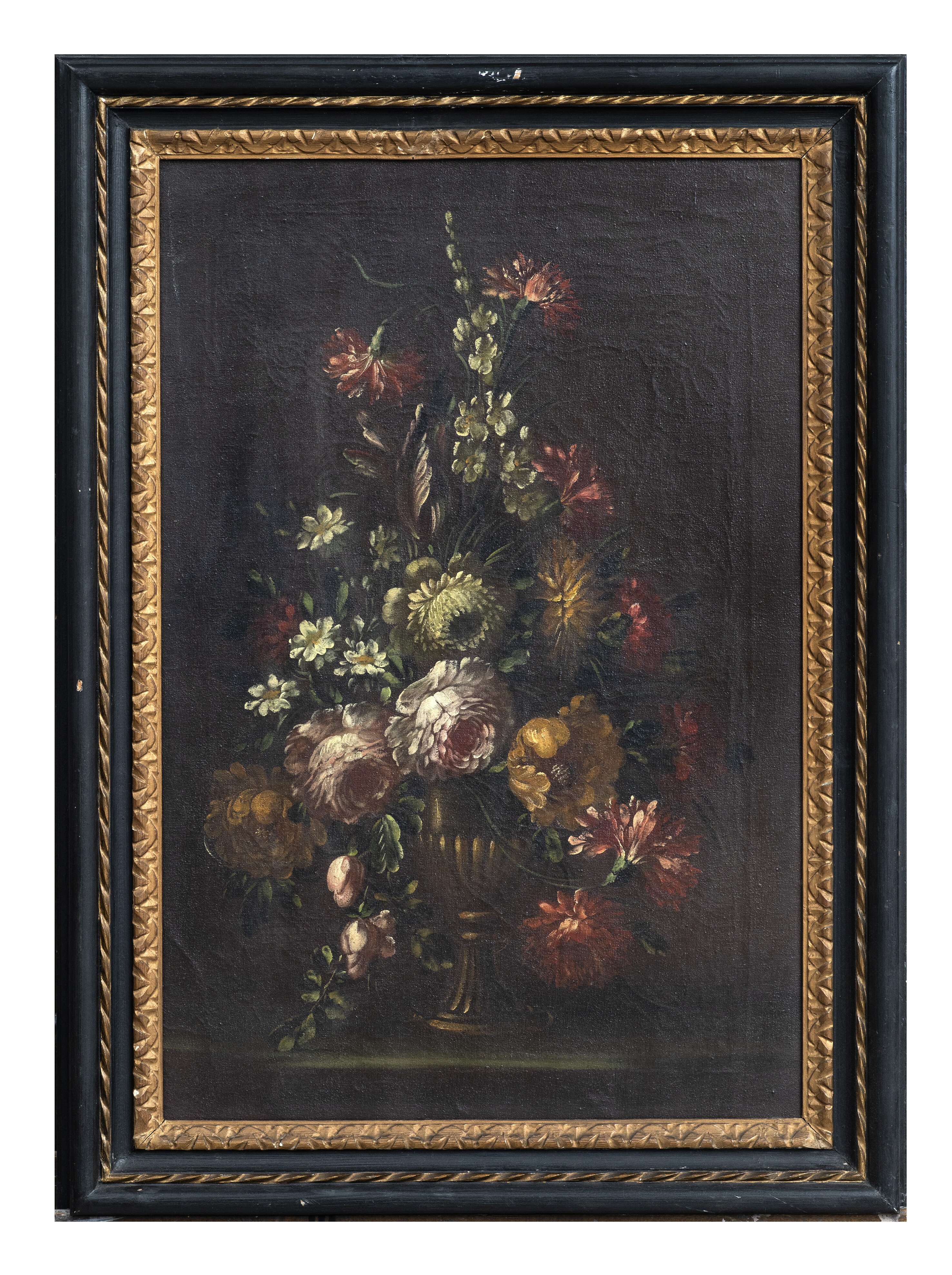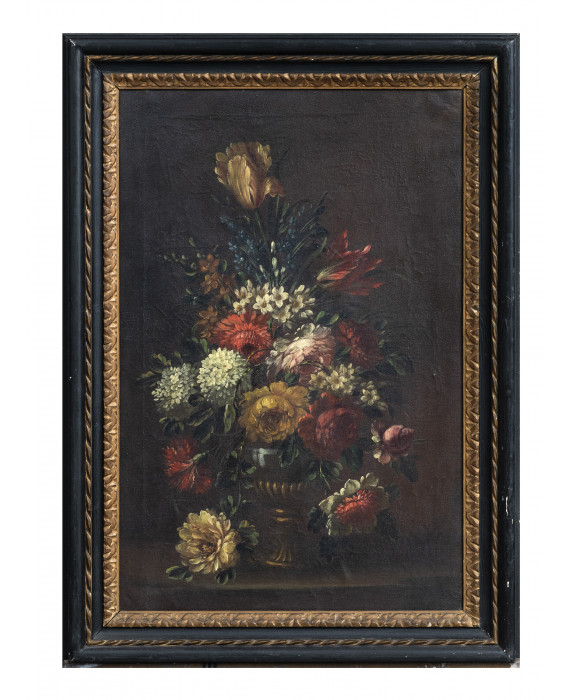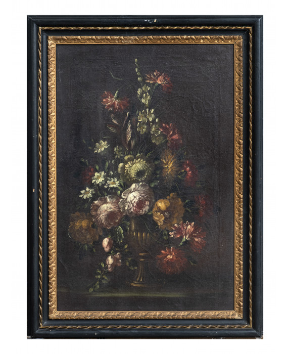 PITTORE ROMANO ACCADEMICO, INIZI XX SECOLO VASO CON COMPOSIZIONE DI FIORI VASO CON COMPOSIZIONE DI FIORI Coppia di dipinti ad olio su tela, cm. 75 x 50 Cornici a lacca nera con decori in oro di recente manifattura CORNICI Cornici ebanizzate con bacchetta in oro, del XX secolo