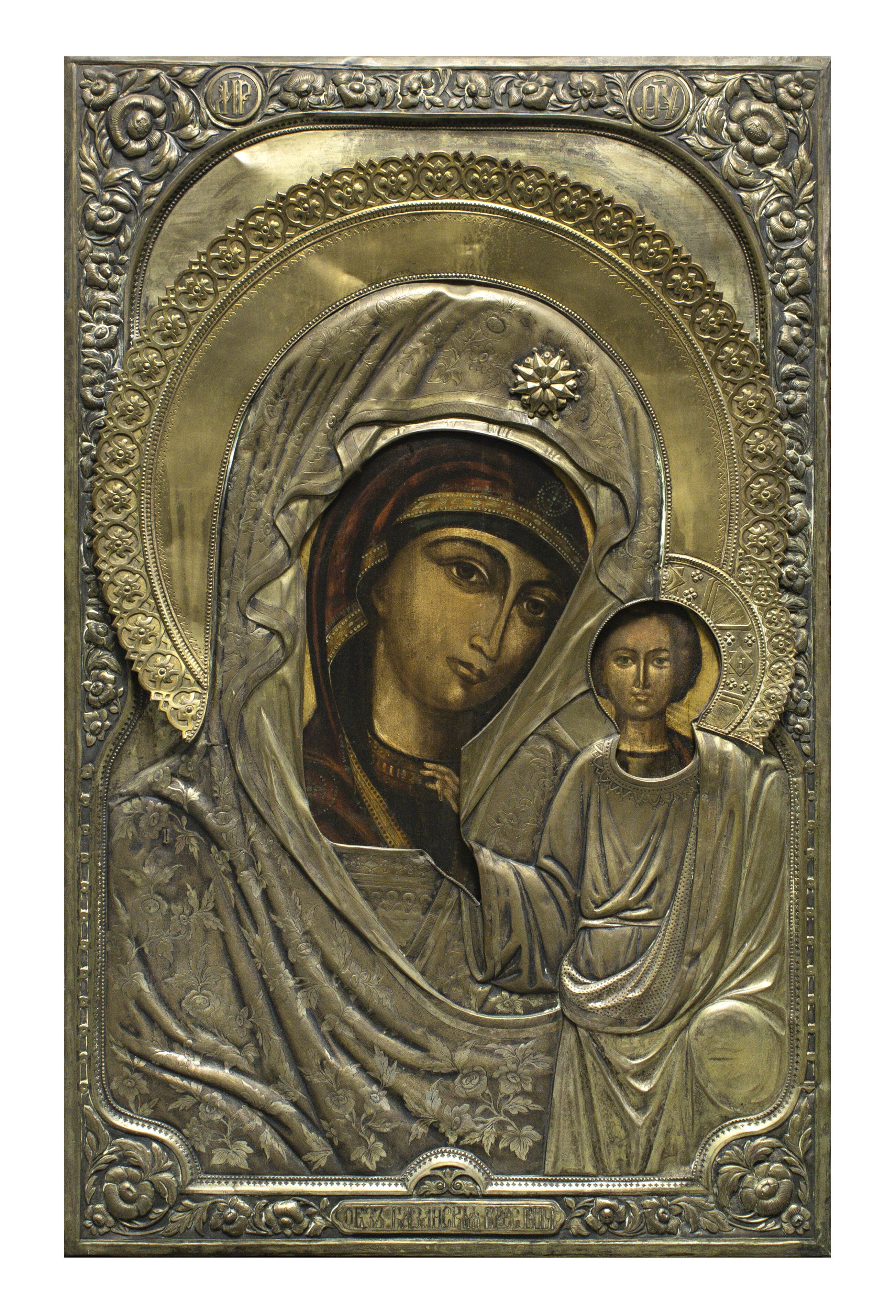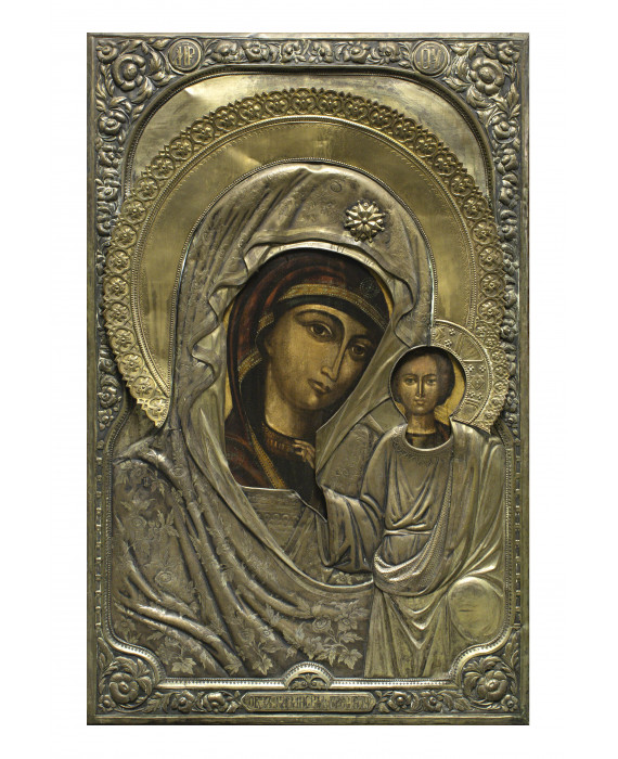 PITTORE DELLA SCUOLA DI KAZAN, FINE XIX SECOLO ICONA MADRE DI DIO DI KAZAN Tempera su tavola, parchettata, cm. 112 x 70 Riza in metallo dorato e sbalzato
