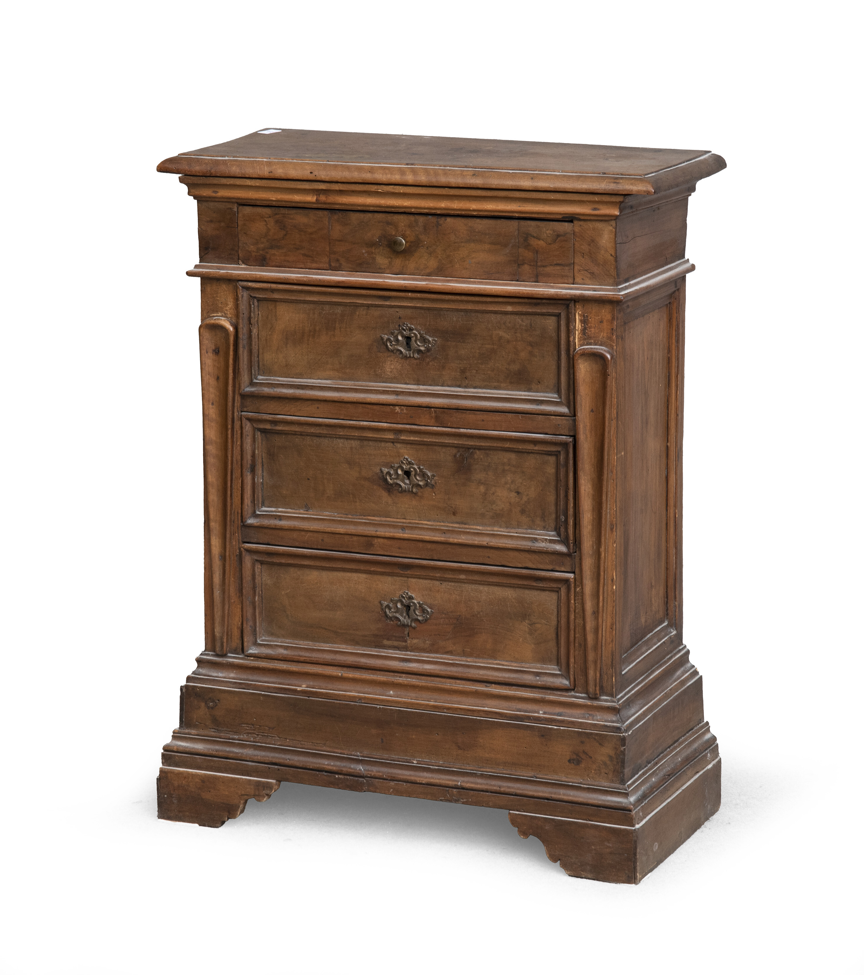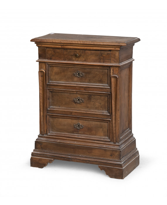 PICCOLO COMÒ IN NOCE, ITALIA CENTRALE XVIII SECOLO a quattro cassetti a bordi modanati e laterali con cartelle a goccia. Piedi a mensola. Misure cm. 86 x 65 x 29.
