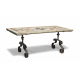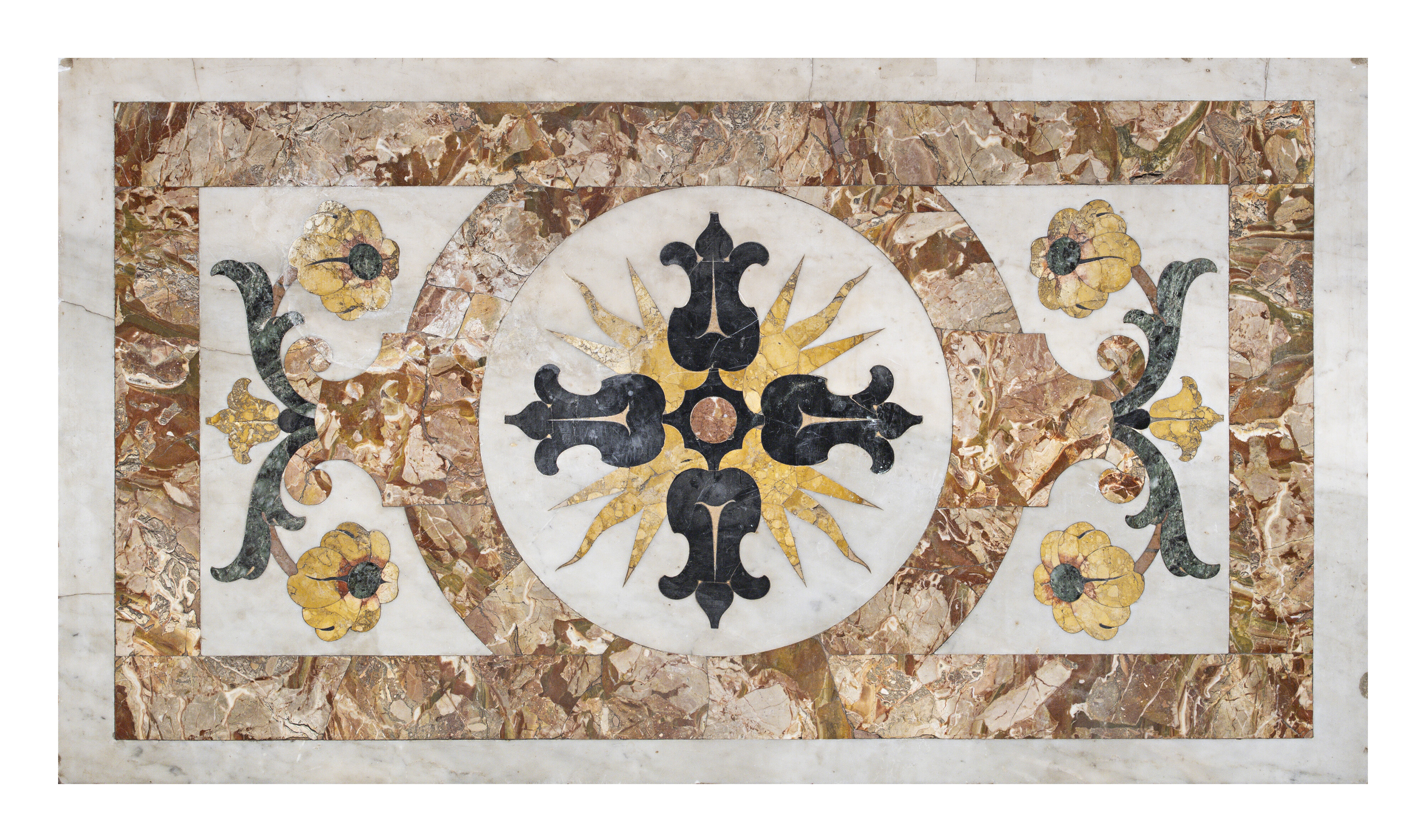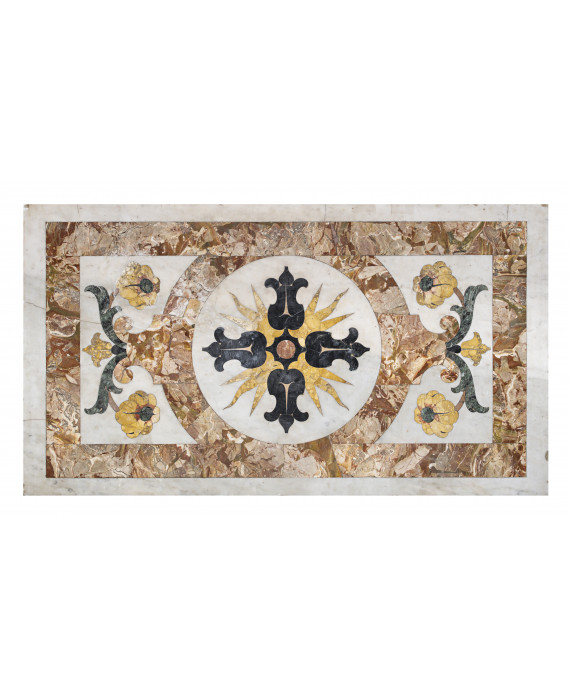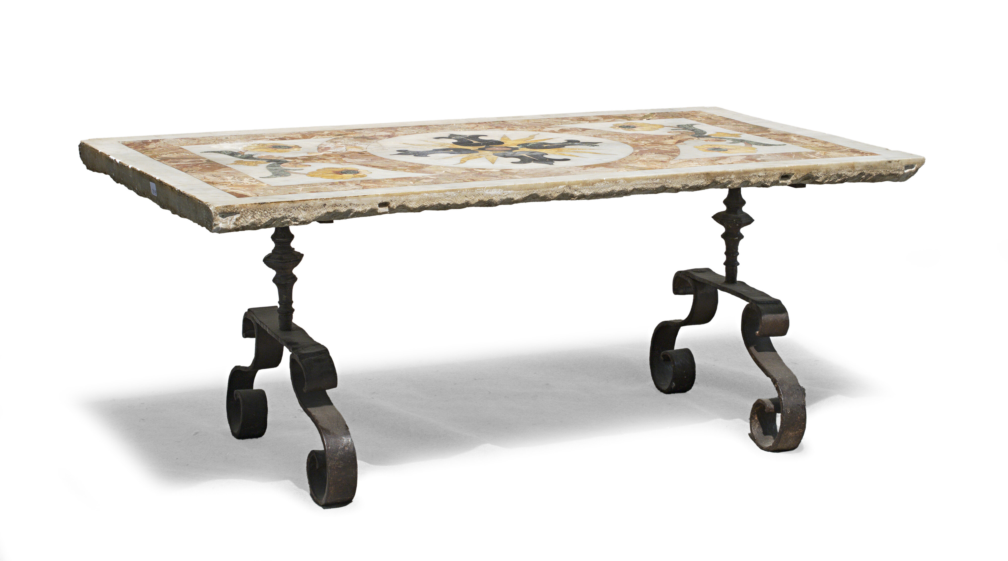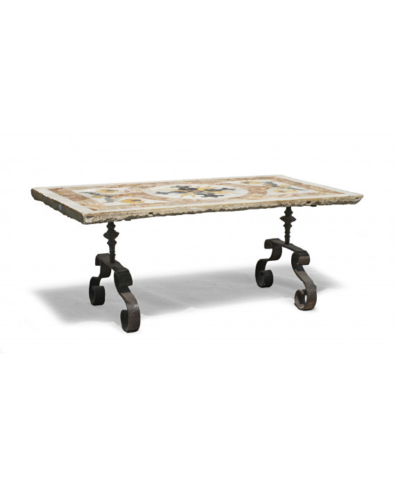 TAVOLO CON PIANO MARMI INTARSIATI XVIII SECOLO Tavolo composto da paliotto intarsiato in marmi policromi, con sostegno in ferro battuto. Difetti. Toscana, XVIII secolo. Misure cm. 118x65x50.
