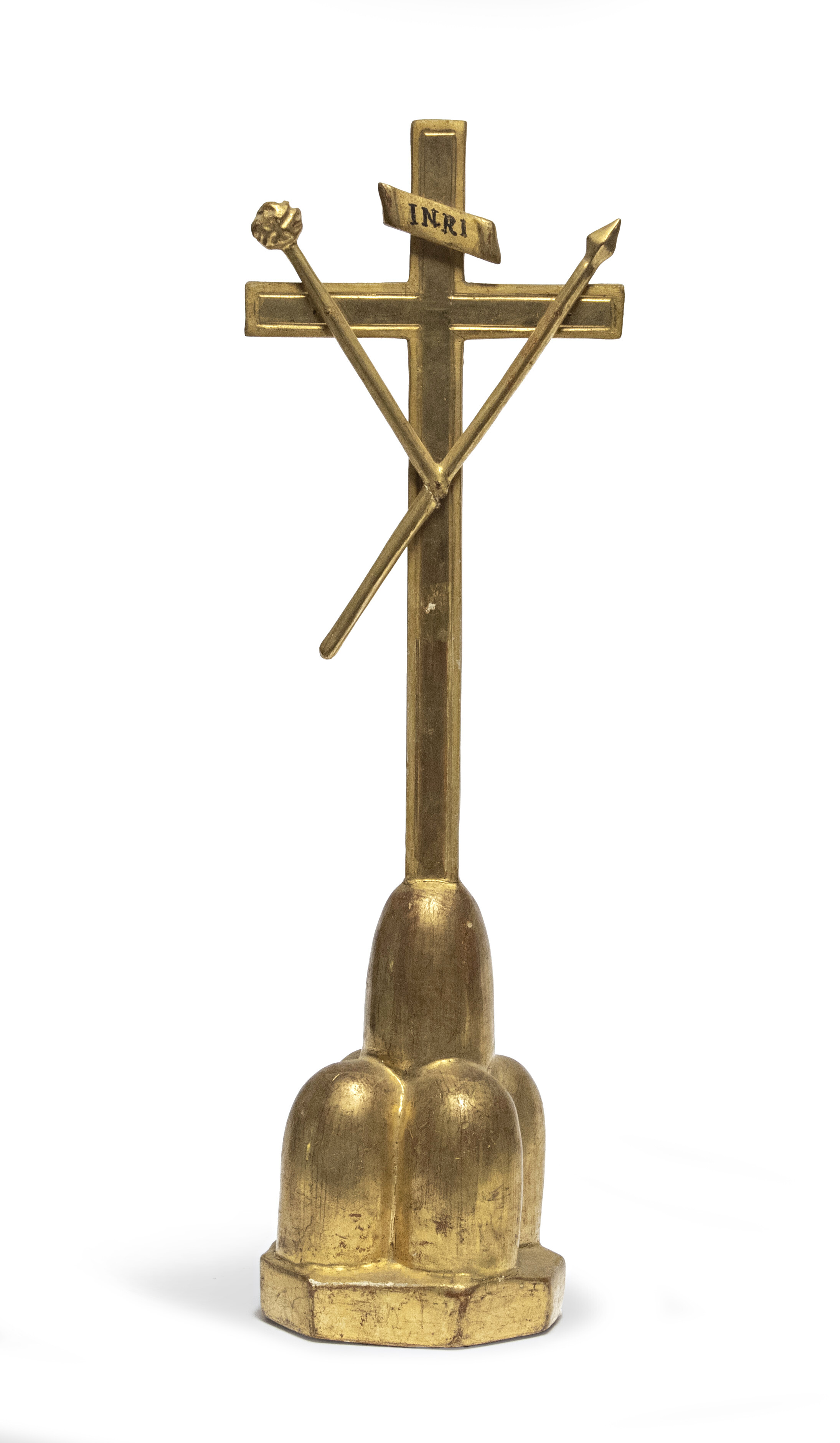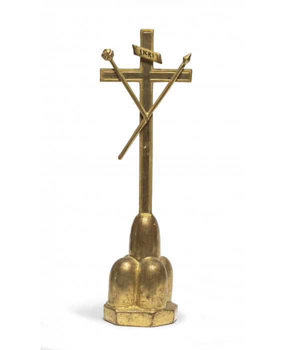 CROCIFISSO IN LEGNO DORATO, XIX SECOLO con croce di Santandrea. Misure cm. 45 x 13. Mancanza alla Croce.