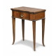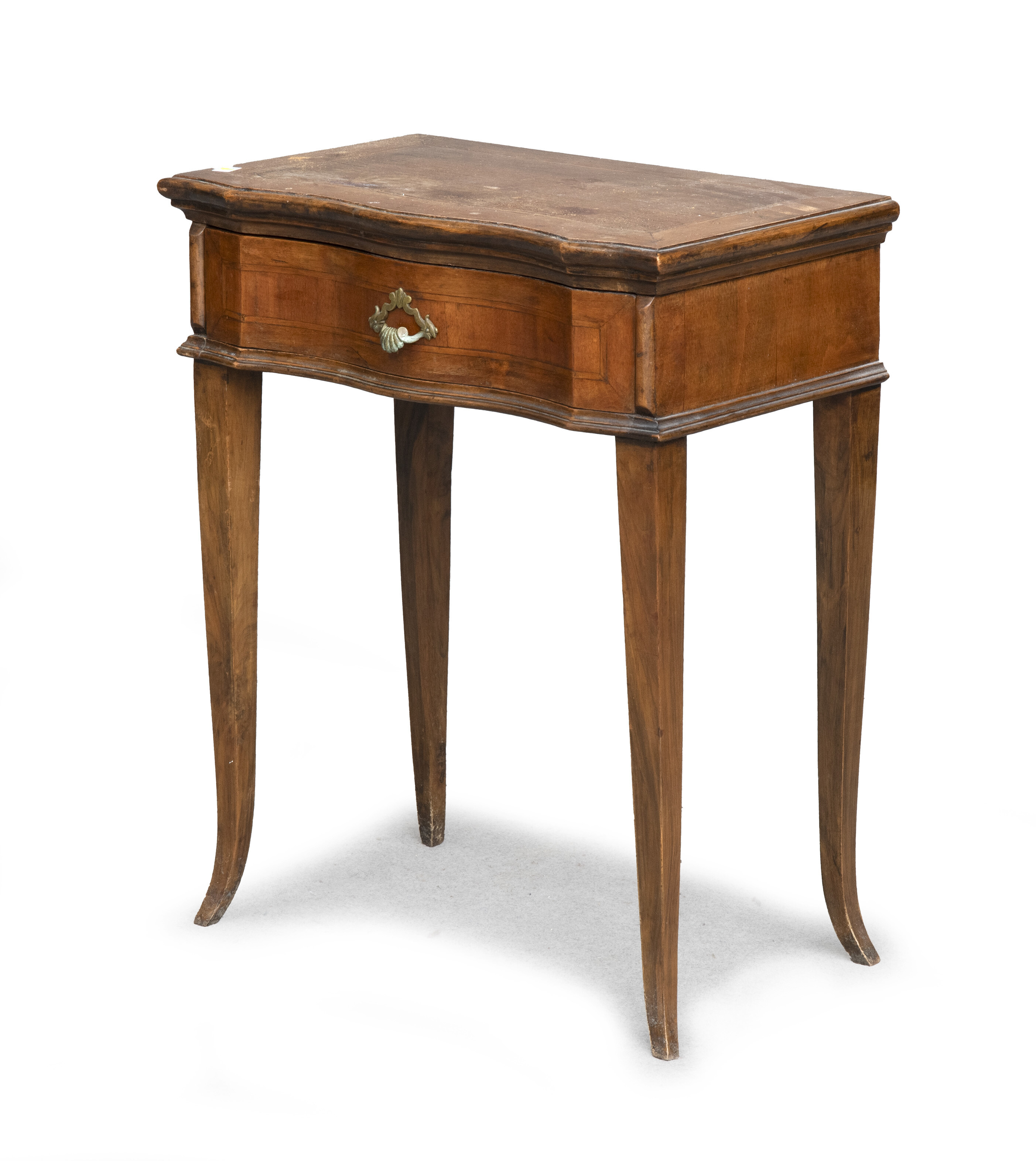 Tavolino in noce con riserve in bosso e fronte mosso ad un cassetto. Gambe con desinenze a sciabola. Elementi antichi. Misure cm. 73 x 61 x 36.