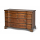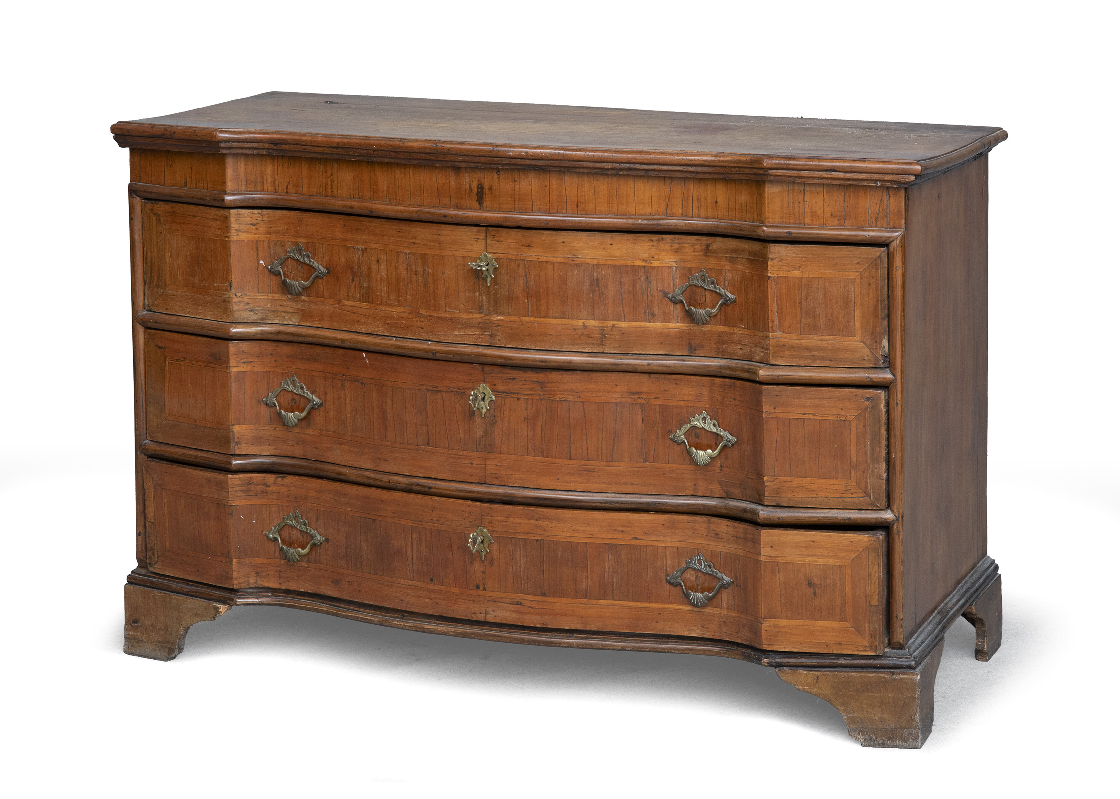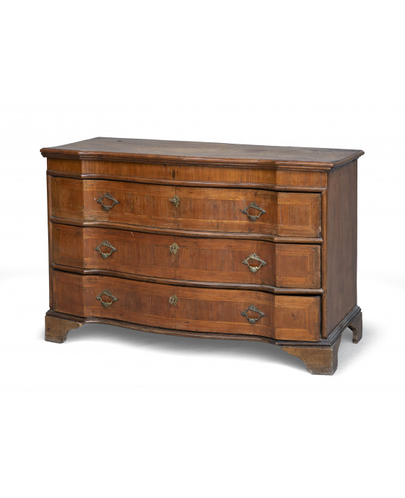 Commode in noce con riserve in ebano viola e filettature in bosso. Fronte mosso e spigolato a tre cassetti, piedi a mensola. Emilia, XVIII secolo. Misure cm. 86 x 127 x 55. Piano superiore trasformato a madia, alcune fodere posteriori postume.