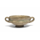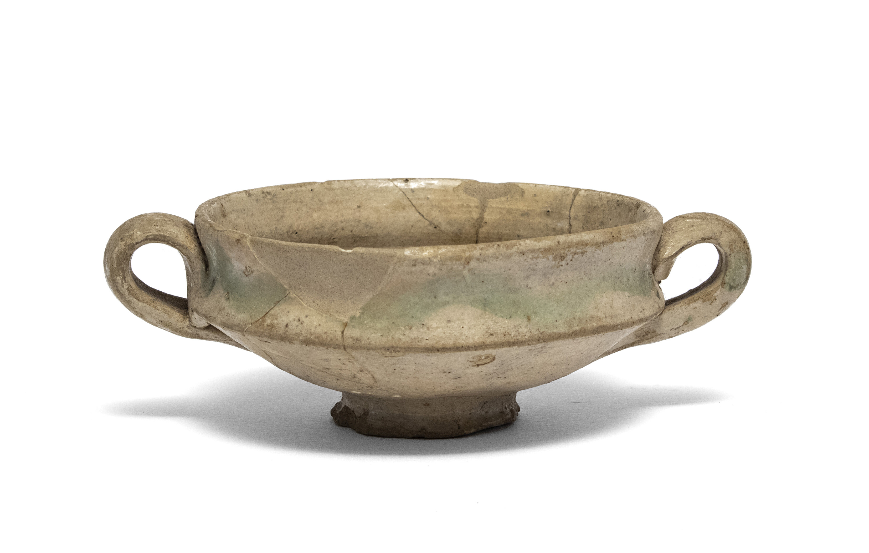 Free bidCIOTOLA IN MAIOLICA, LAZIO XV SECOLO a smalto crema con decoro in verde e fiore. Biansata. Misure cm. 5 x 14 x 10. Ricomposta.