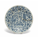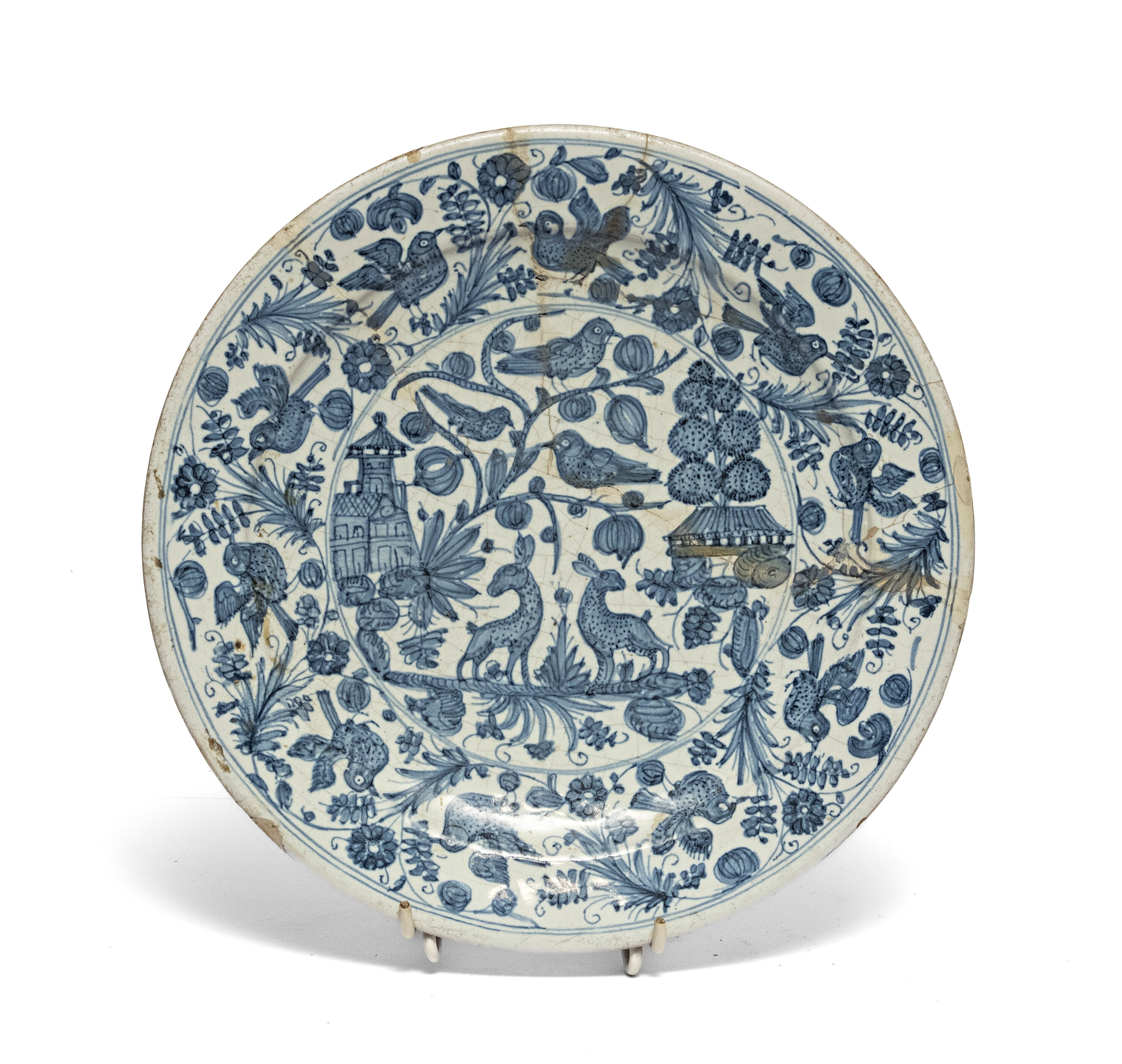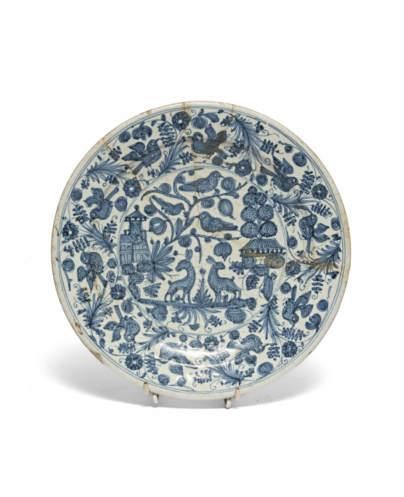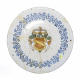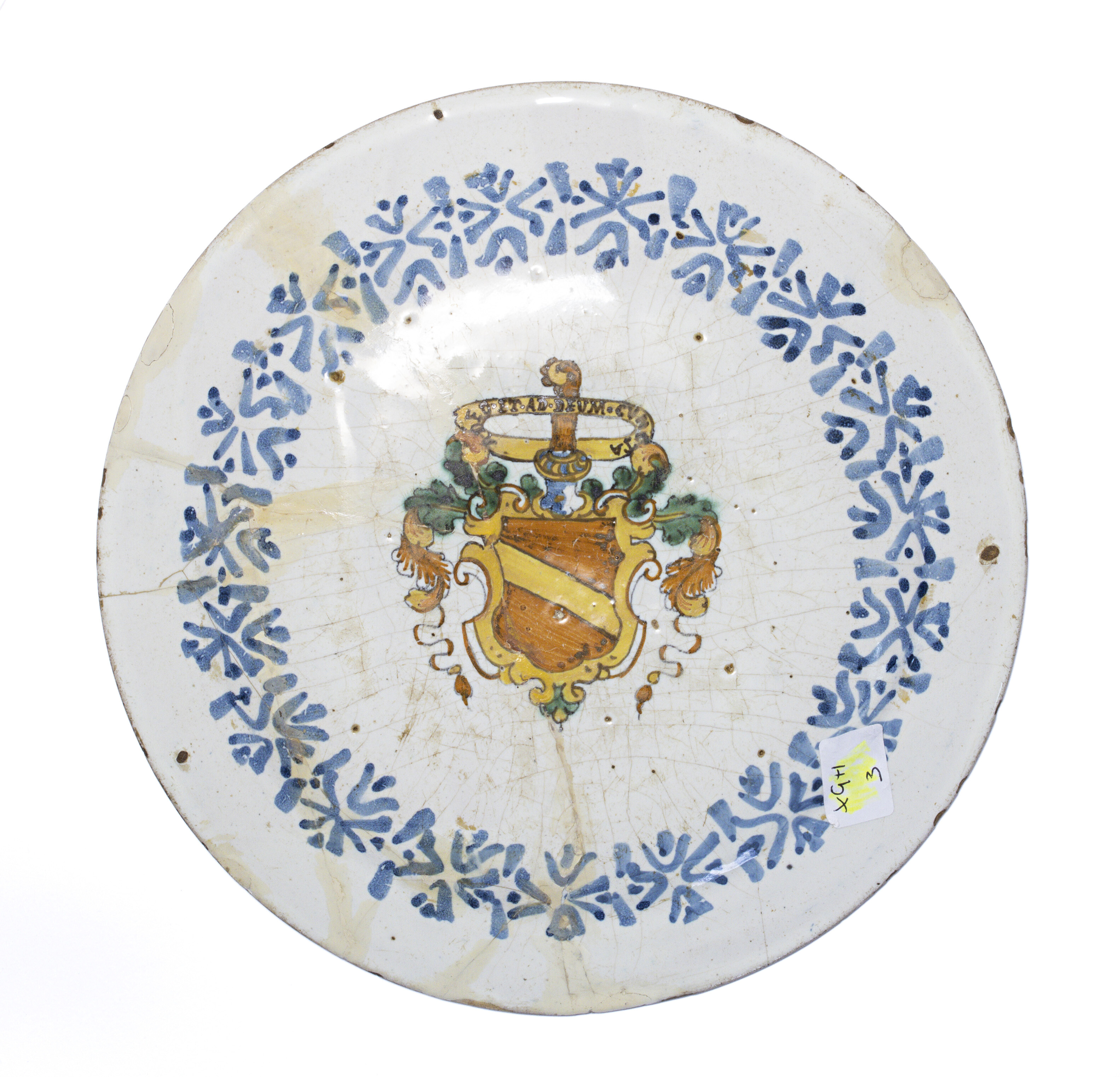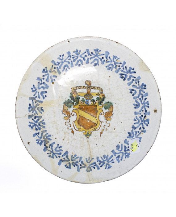 PIATTO IN MAIOLICA, ITALIA CENTRALE XVIII SECOLO a smalto bianco e blu con decoro a motivi vegetali, fiere e case. Retro decorato a stemma di Casata con riserva a ghirlanda. Diametro cm. 25. Ricomposto.