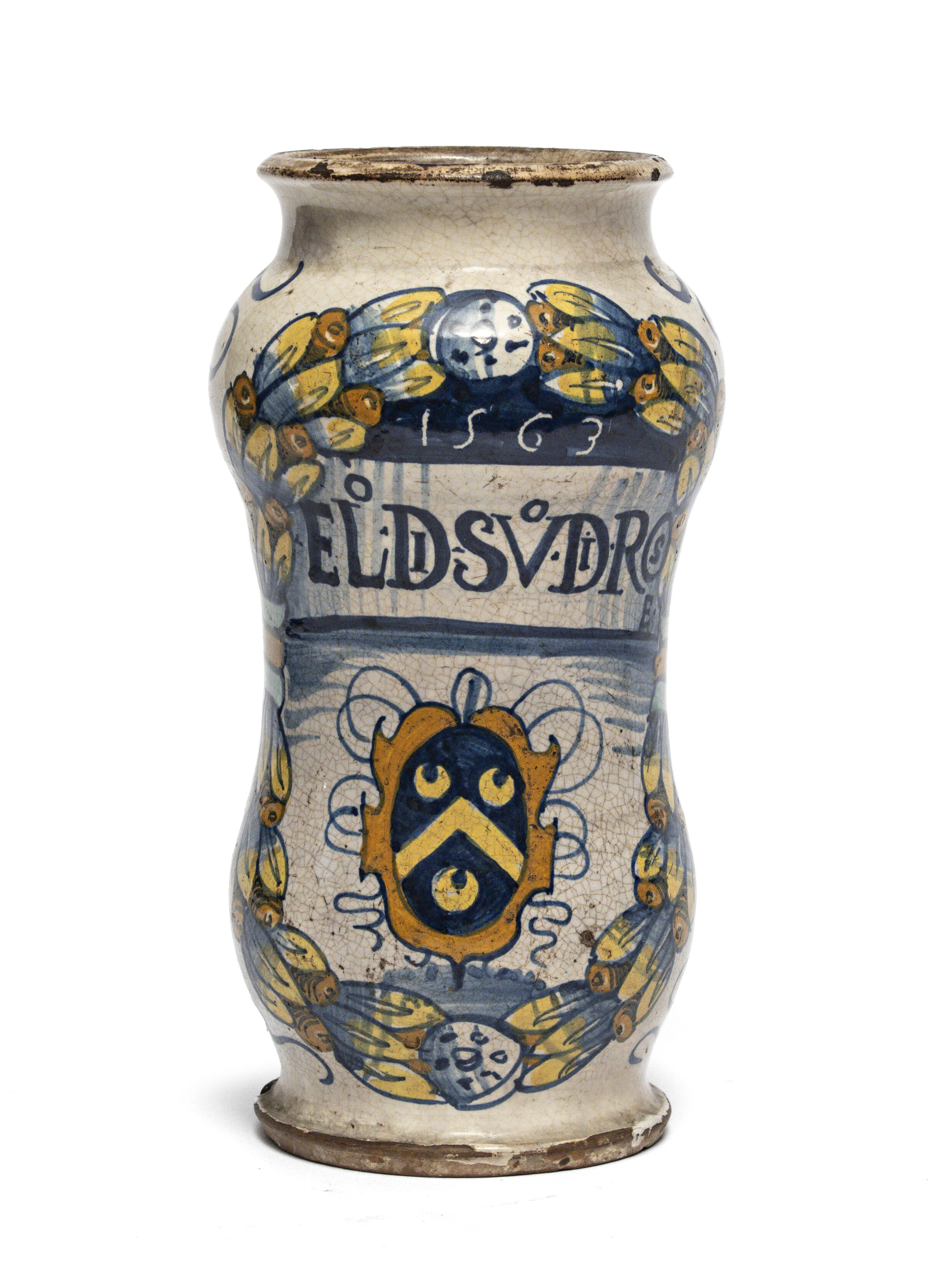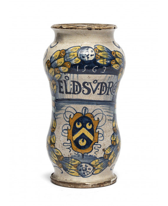 ALBARELLO IN MAIOLICA, DERUTA XVIII SECOLO a smalto bianco e policromia, con decoro a stemma con iscrizione farmaceutica entro ghirlanda. Misure cm. 22 x 12. Sbeccature e cadute di smalto.