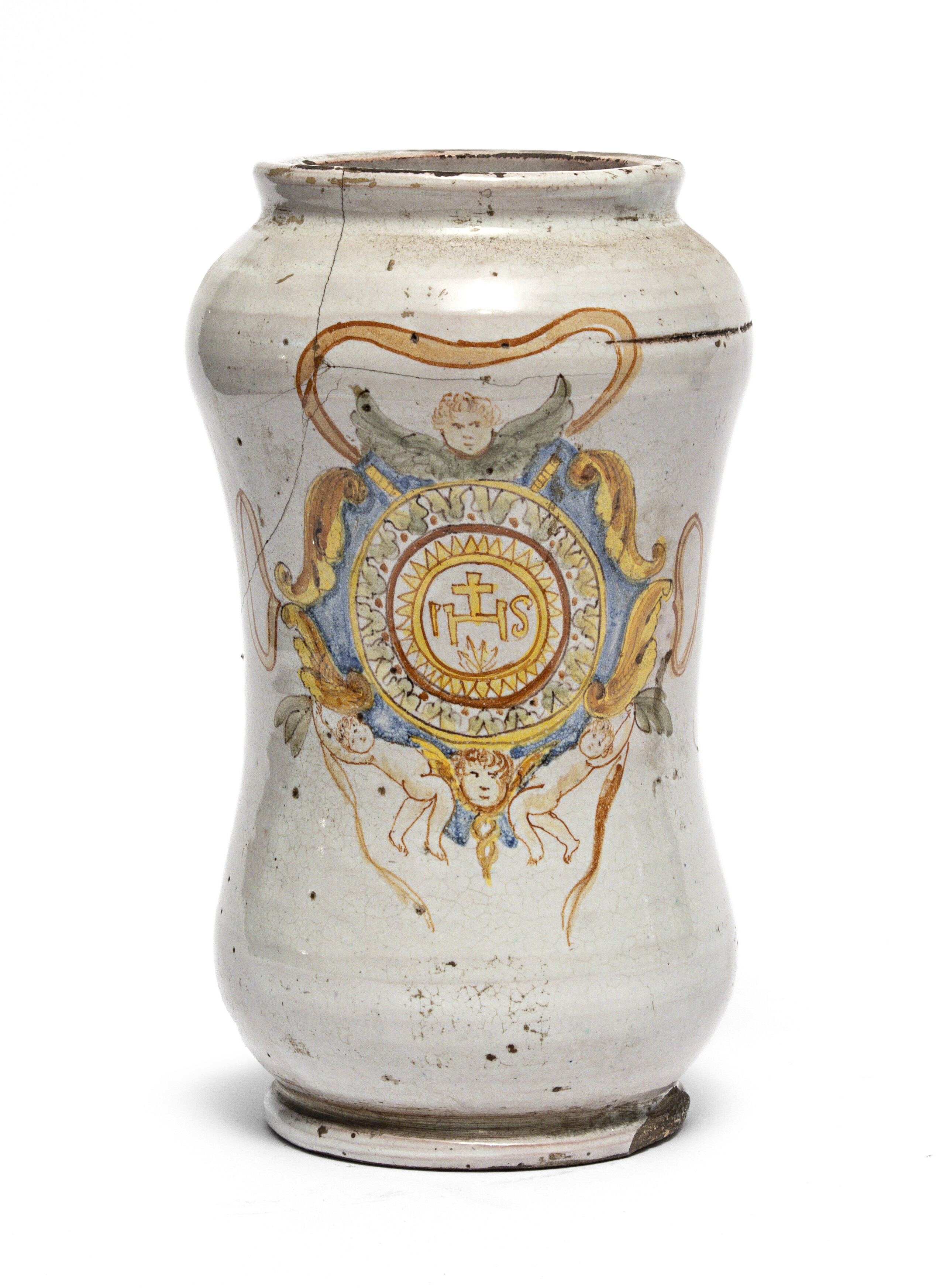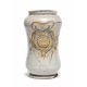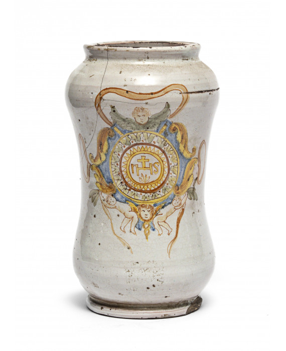ALBARELLO IN MAIOLICA, CASTELLI XIX SECOLO a smalto bianco con decoro a stemma di Casata in policromia. Misure cm. 22 x 13. Mancanze alla base, felature.