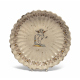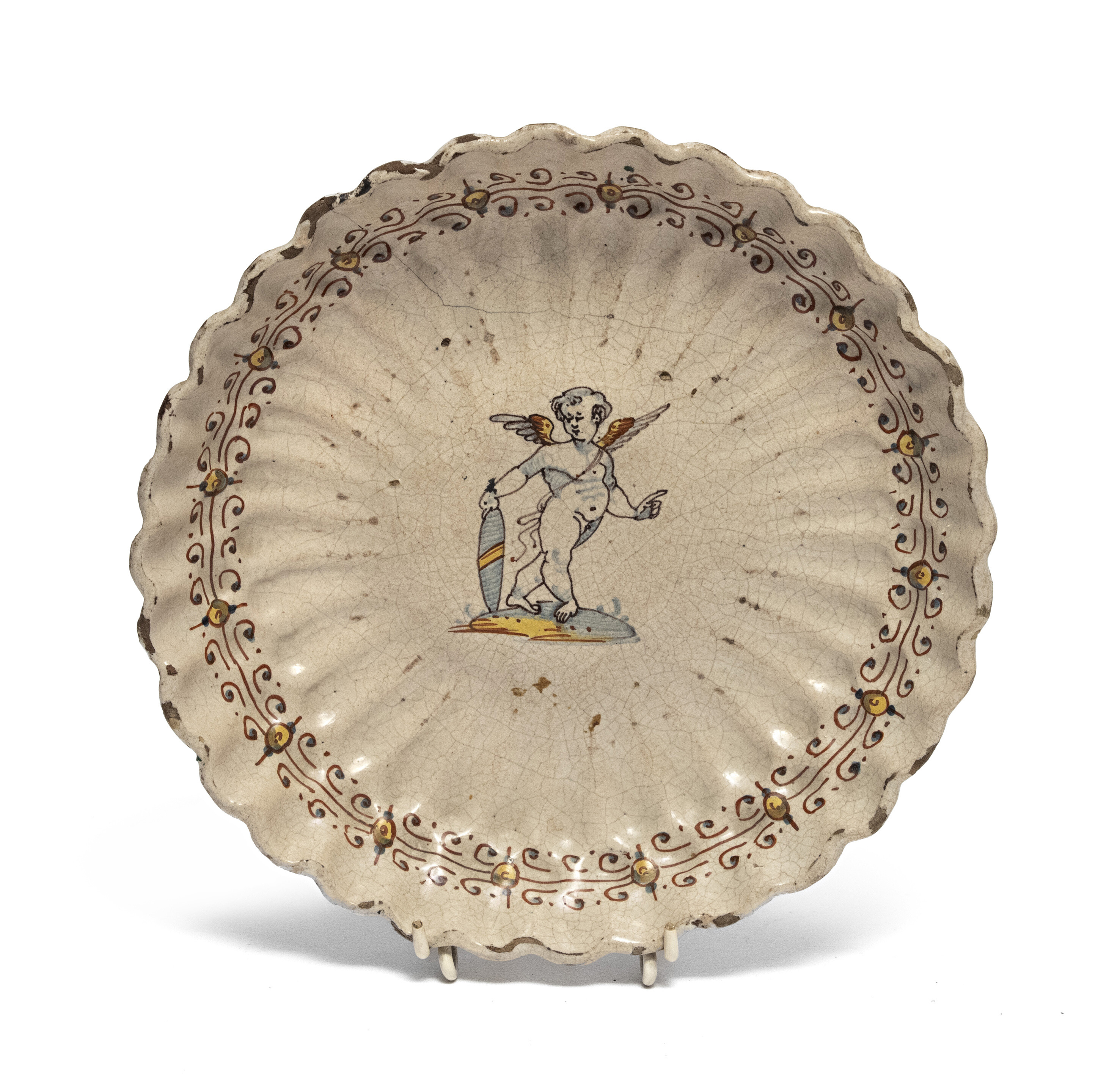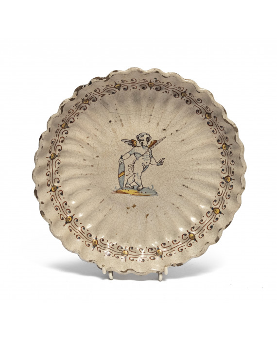 CRESPINA IN MAIOLICA, DERUTA XVII SECOLO a smalto crema e policromia, con decoro a figura di cherubino con scudo al centro e bordo a fiori di tacchiolo. Misure cm. 5 x 24.