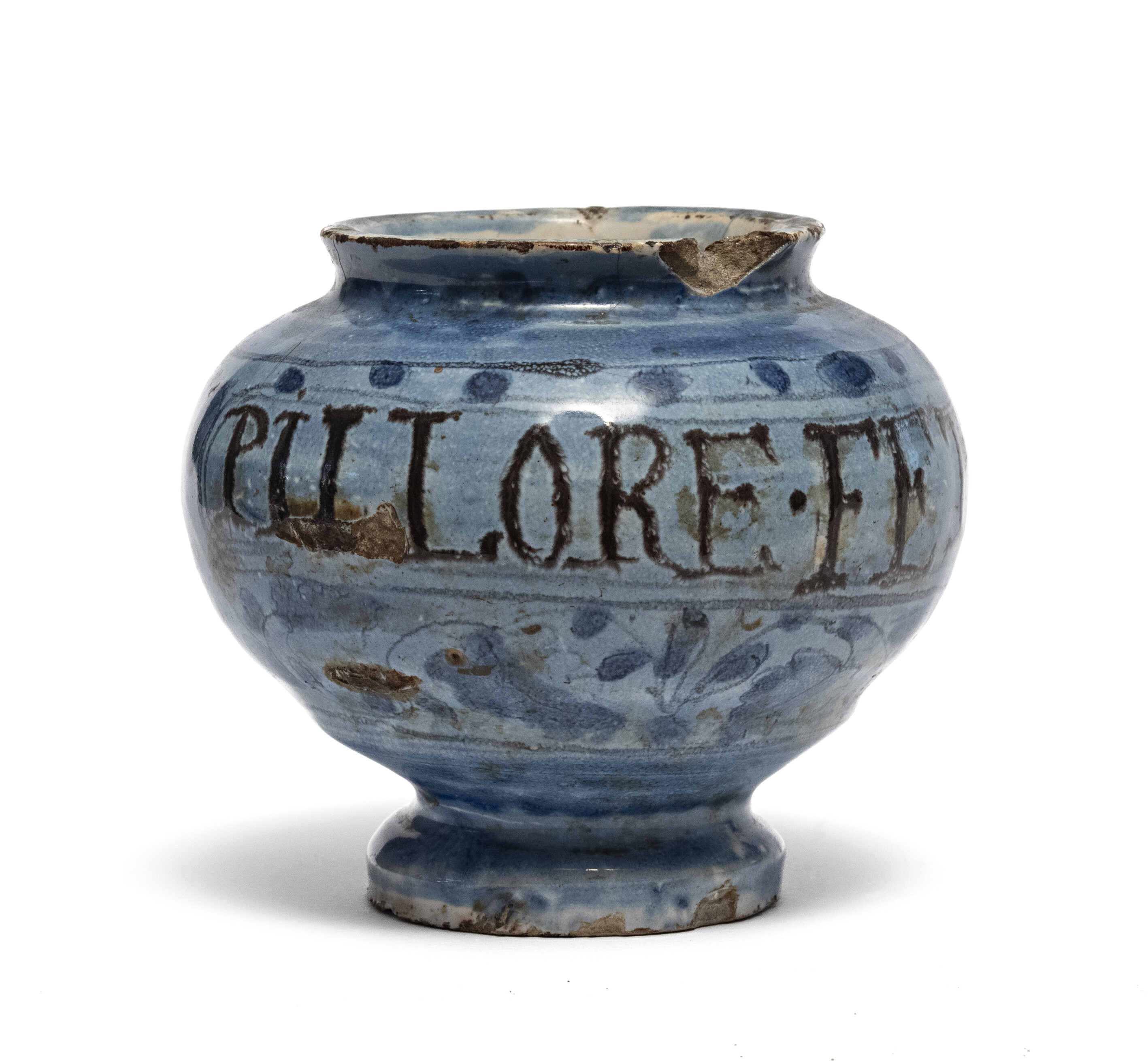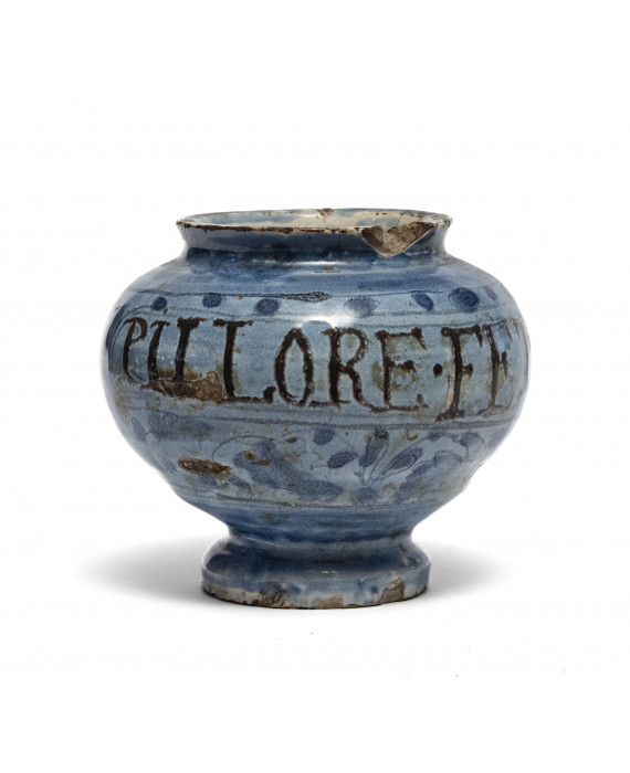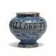VASO IN MAIOLICA, XVII SECOLO a fondo blu berrettino con iscrizioni farmaceutiche. Misure cm. 11 x 12. Mancanze e sbeccature.