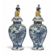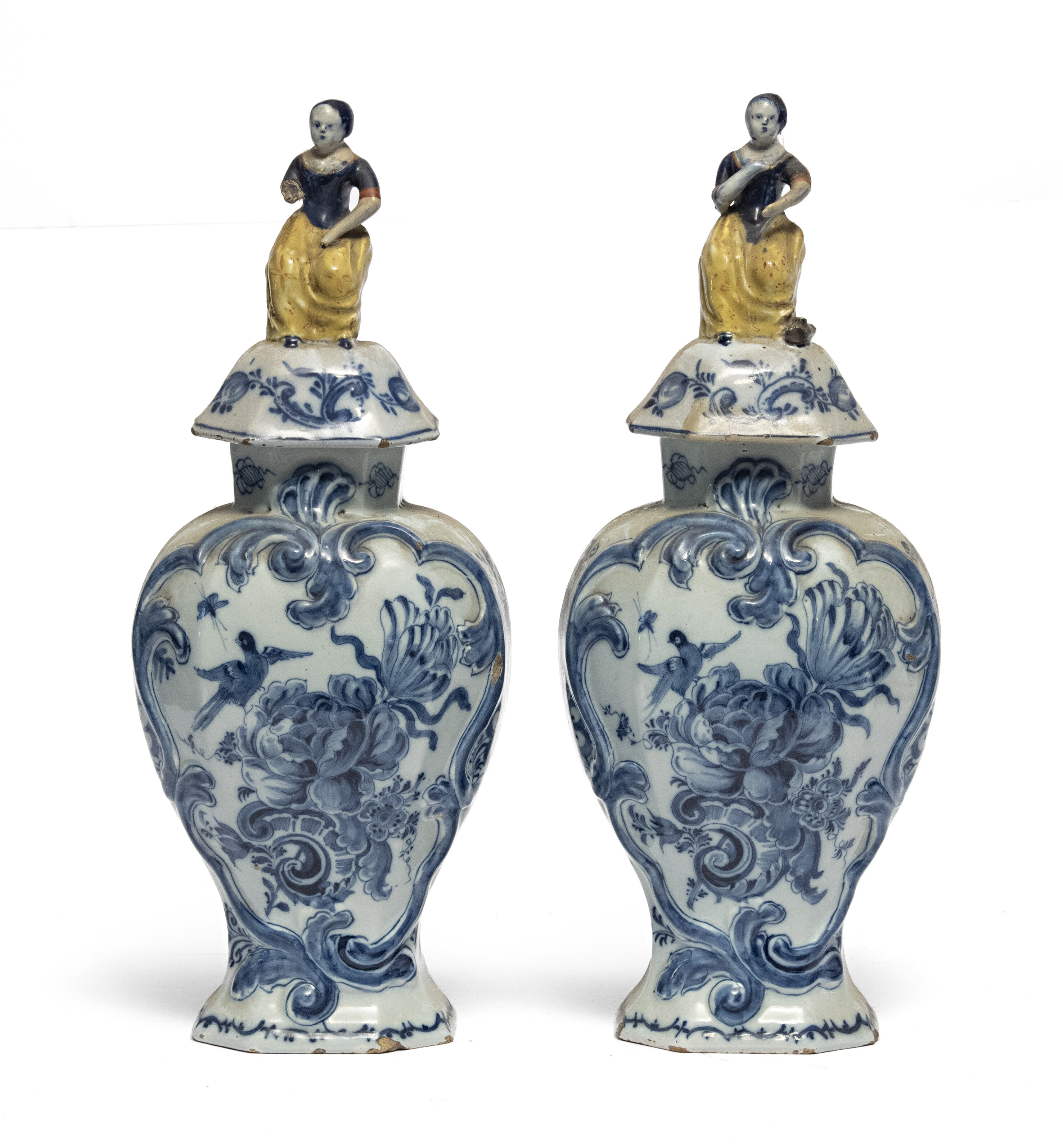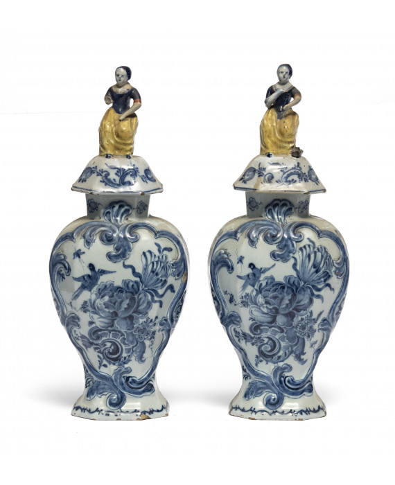 COPPIA DI POTICHES IN CERAMICA, DELFT XIX SECOLO a smalto bianco e blu con decori al corpo a motivi vegetali. Coperchi con figure femminili. Misure cm. 35 x 14 x 11. Rottura ad un braccio di una figurina.