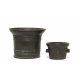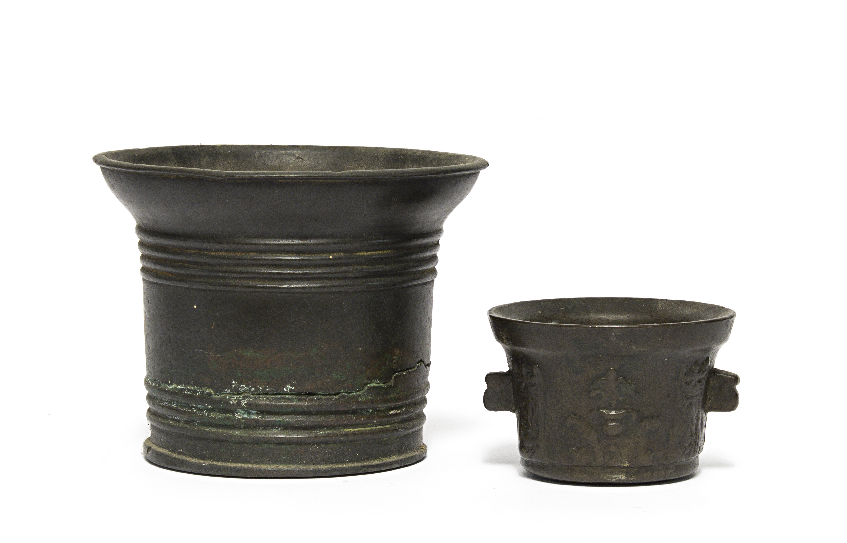DUE MORTAI BRONZO TOSCANA XVII SECOLO Due mortai in bronzo a patina bruna. Il più piccolo presenta, sulla fascia, decorazioni a rilievo raffiguranti torri e d elementi vegetali. Toscana, XVII secolo Misure cm 12 x 15 e cm 6 x 9.