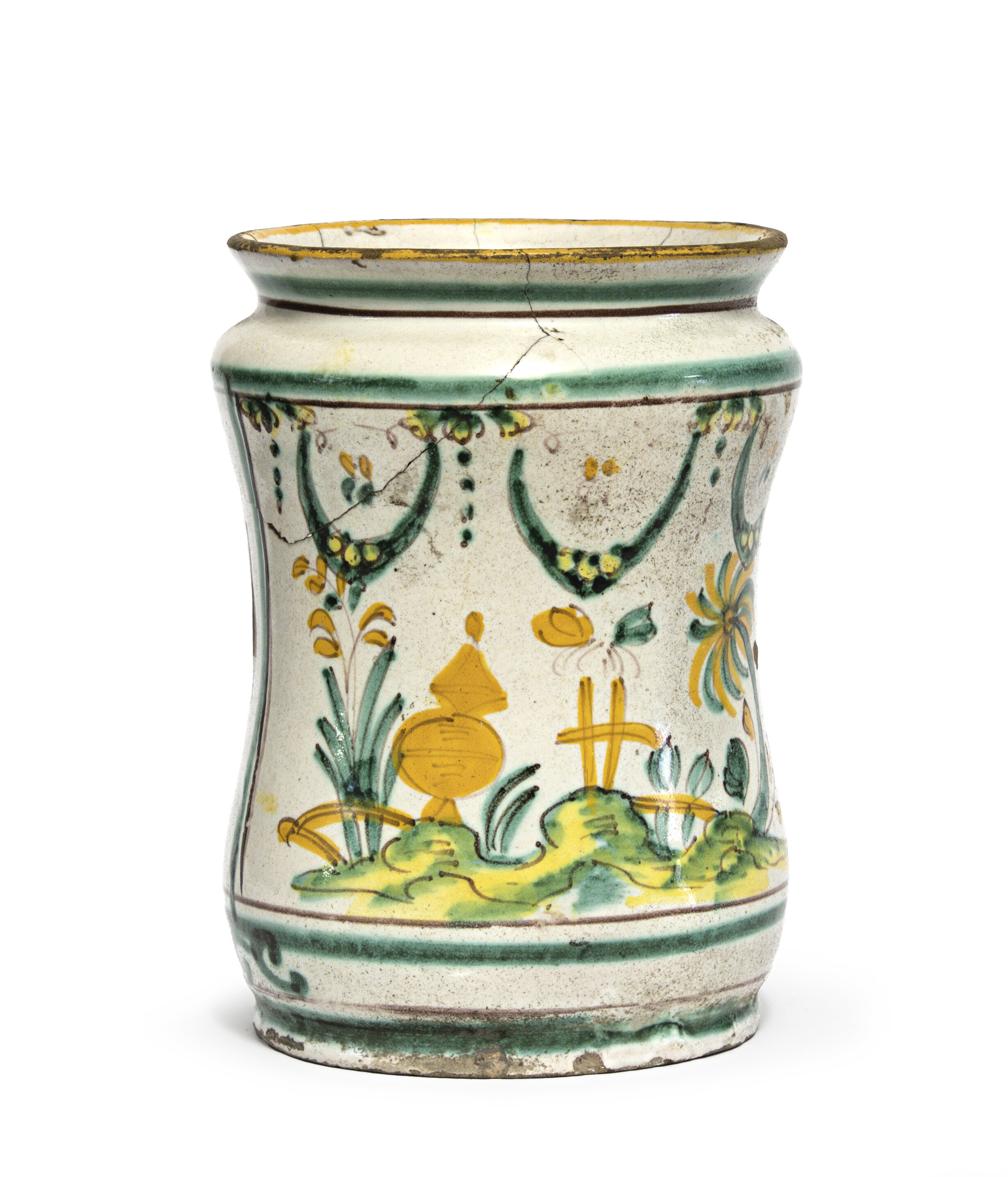 ALBARELLO IN MAIOLICA XVIII SECOLO Albarello in maiolica policroma decorato con paesaggio stilizzato. Rotture e difetti. Misure: alt.cm.18 Italia centrale XVIII secolo