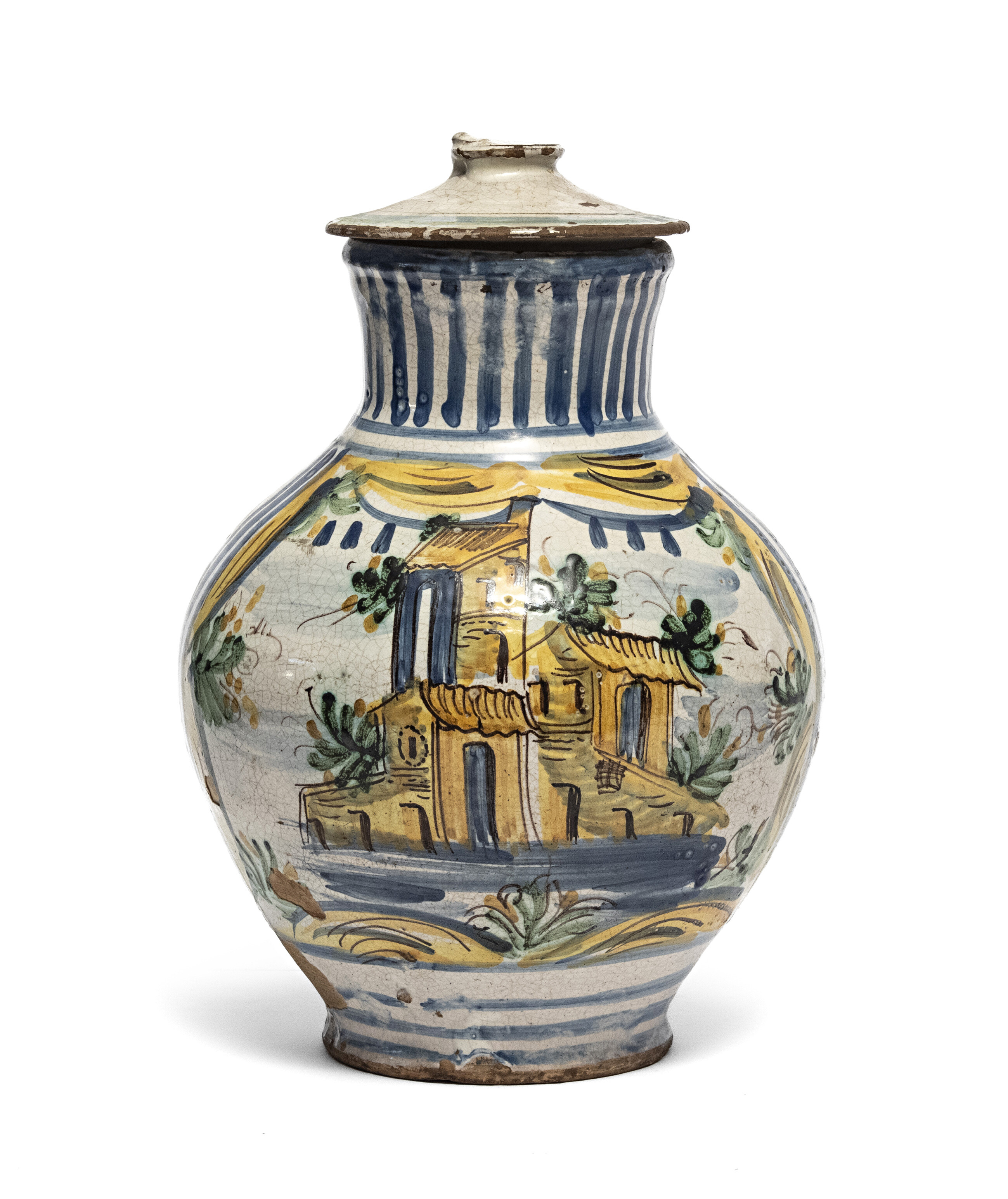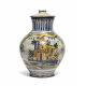 VASO IN MAIOLICA, XIX SECOLO a smalti policromi, con decoro a proscenio a veduta di castello. Filettature in blu. Completo di coperchio non pertinente. Misure cm. 30 x 19. Felature e sbeccature.