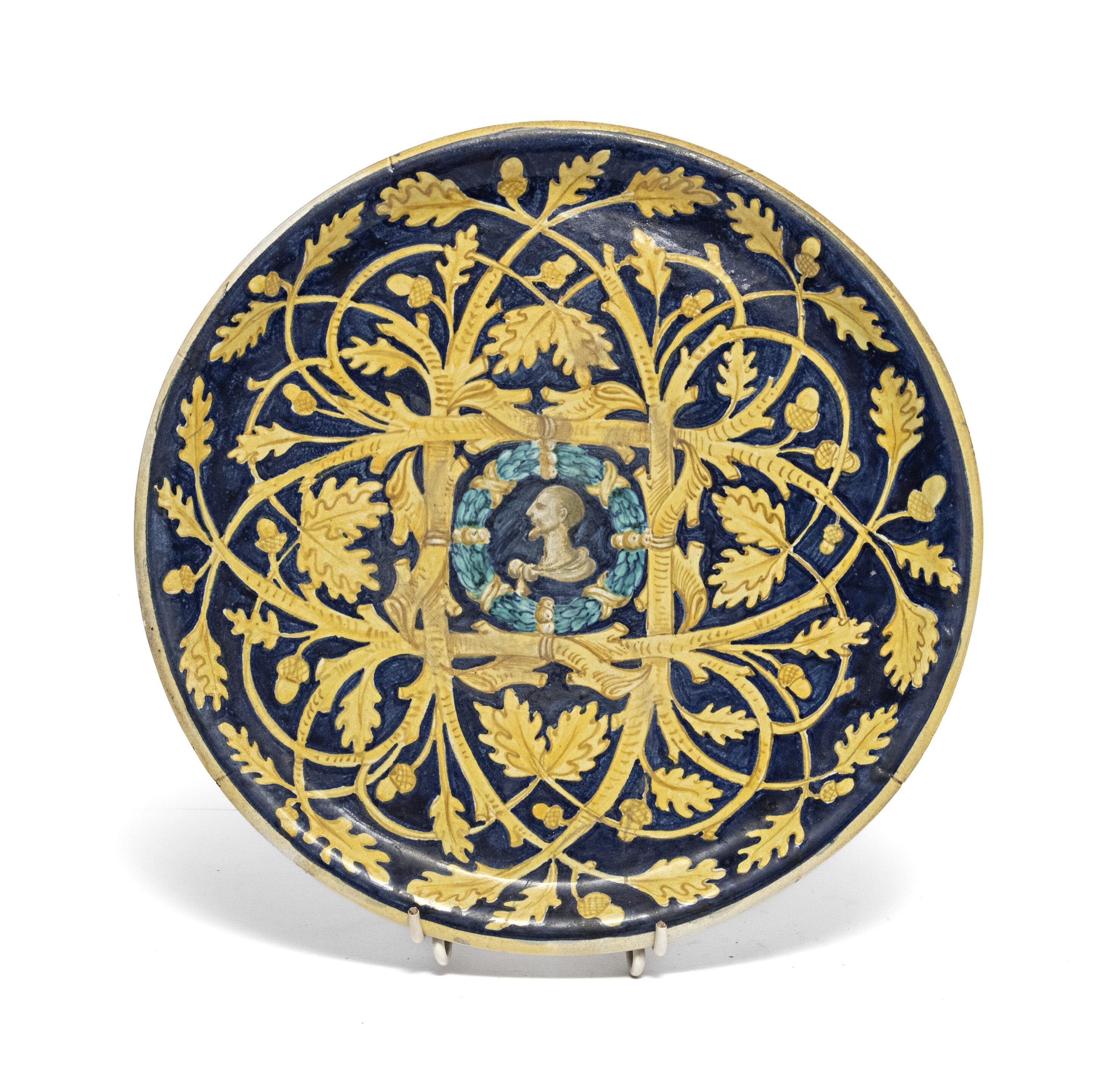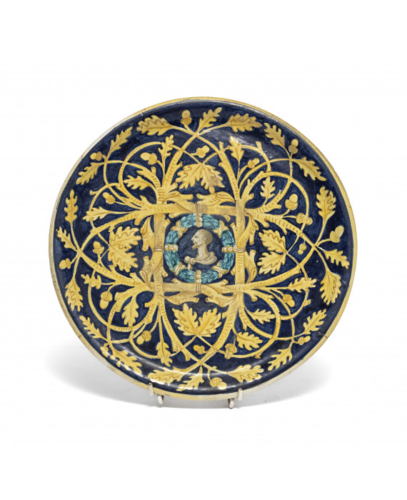 PIATTO IN MAIOLICA, URBINO XIX SECOLO da modello cinquecentesco, in policromia con decoro a cerquate. Diametro cm. 27.