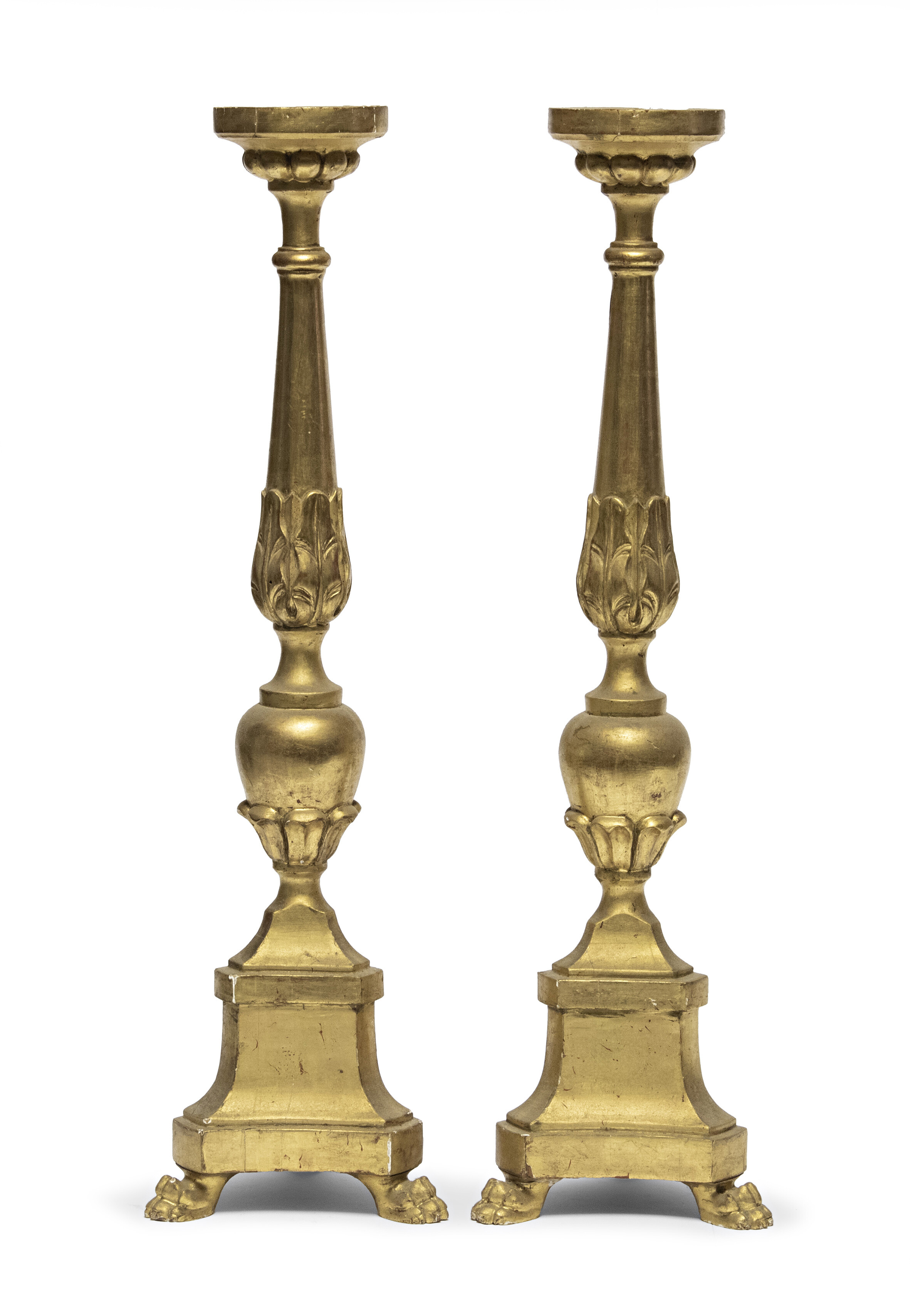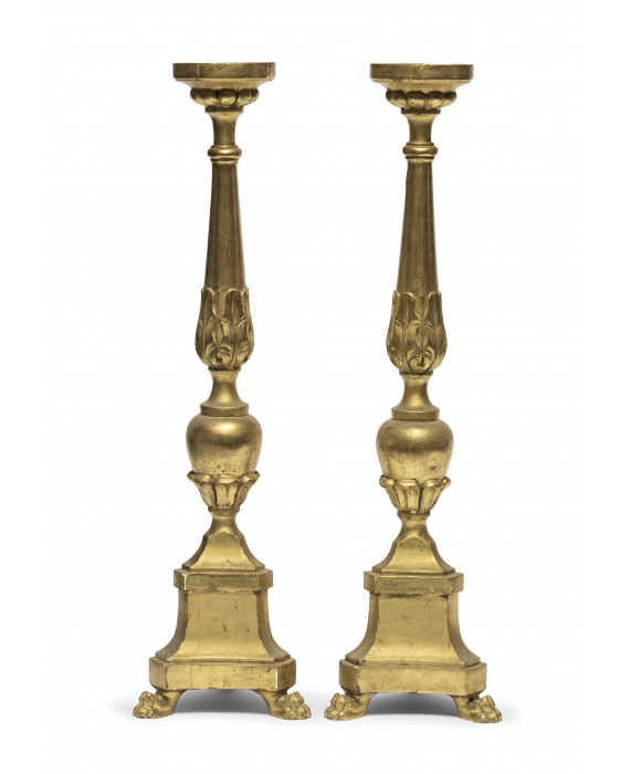 COPPIA DI CANDELIERI IN LEGNO DORATO, INIZI XIX SECOLO con fusto incamiciato a foglie e piedi ferini. Misure cm. 61 x 21.