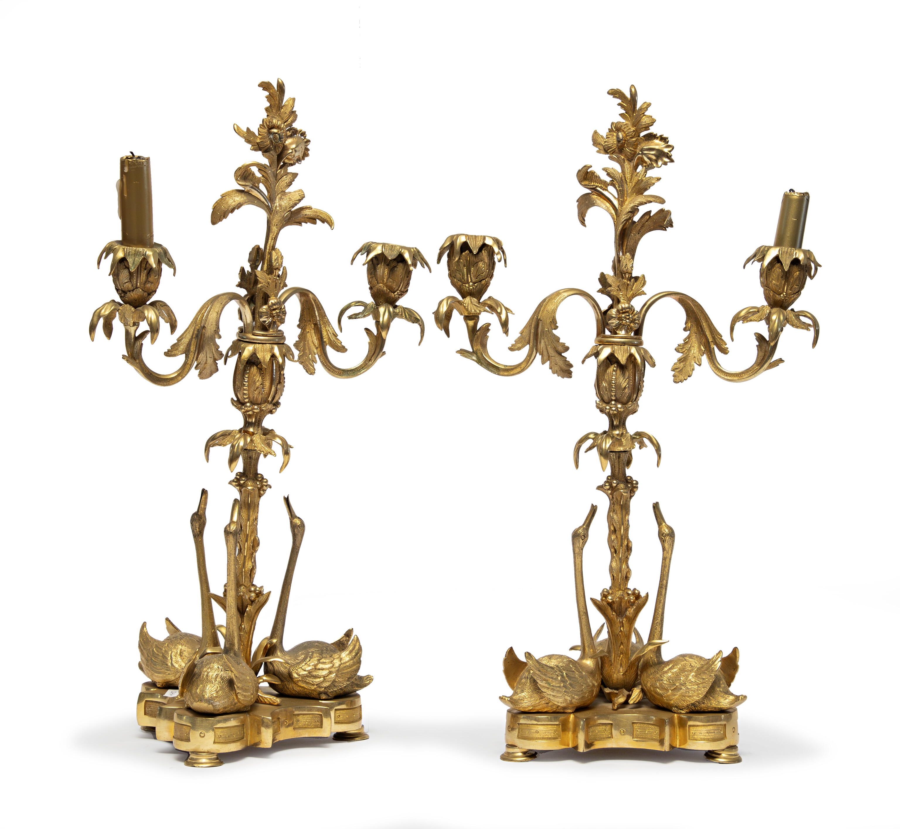 SPLENDIDA COPPIA DI CANDELABRI IN BRONZO DORATO, INIZI XIX SECOLO con doppiere con braccia a ramages fogliate, centrate da arbusto fiorito. Fusto a palmizio, base guarnita da tre figure di fenici. Misure cm. 51 x 32 x 19. PROVENIENZA Famiglia romana