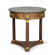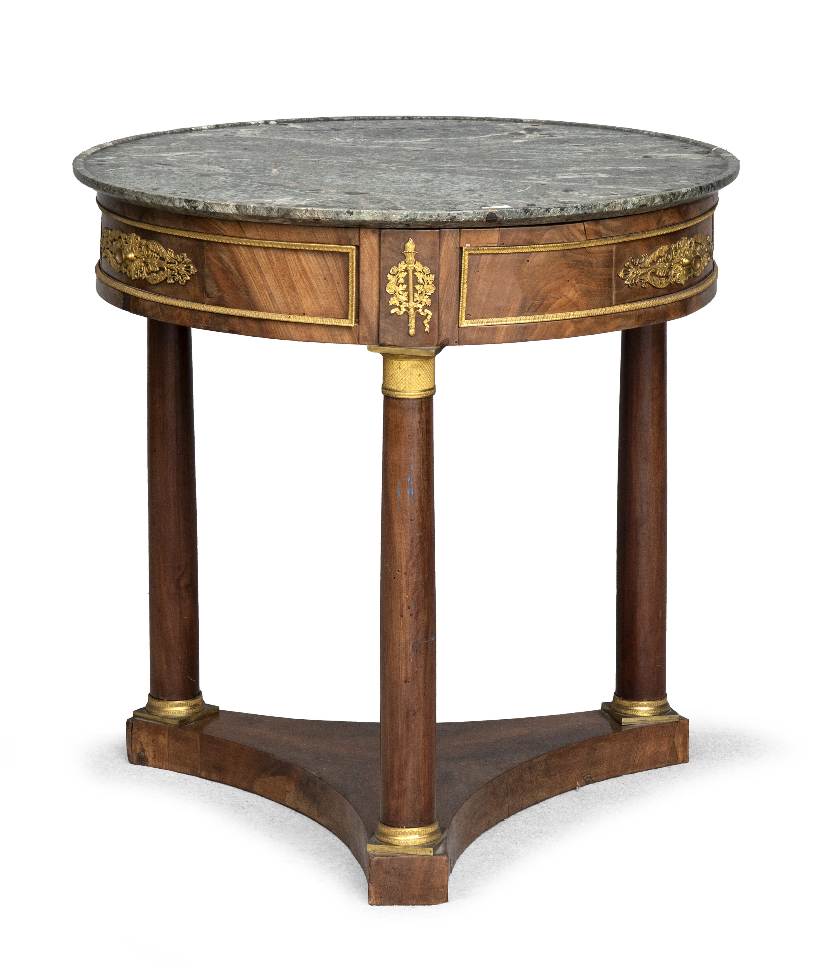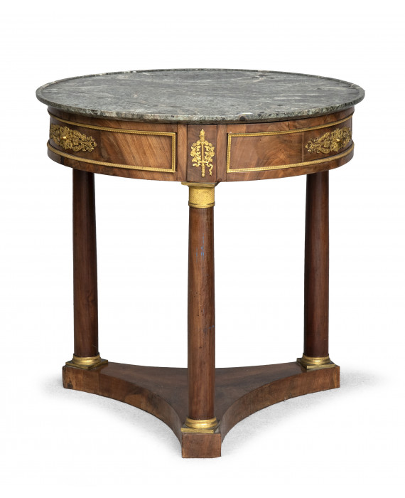 BEL TAVOLO CIRCOLARE, PERIODO IMPERO in noce, con piano in marmo grigio 'griotte'. Fascia guarnita da applicazioni a foglie e corone con frecce. Tre gambe a colonna con base triangolare. Difetti e mancanze Misure cm. 75 x 78.