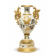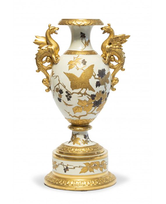 BEL VASO IN PORCELLANA, INIZI XX SECOLO a smalto bianco con decori in argento e oro a racemi con uccelli. Anse a draghi alati, base circolare con bordi a palmette. Una ala mancante. Difetti e rotture. Misure cm. 57 x 34 x 22.