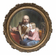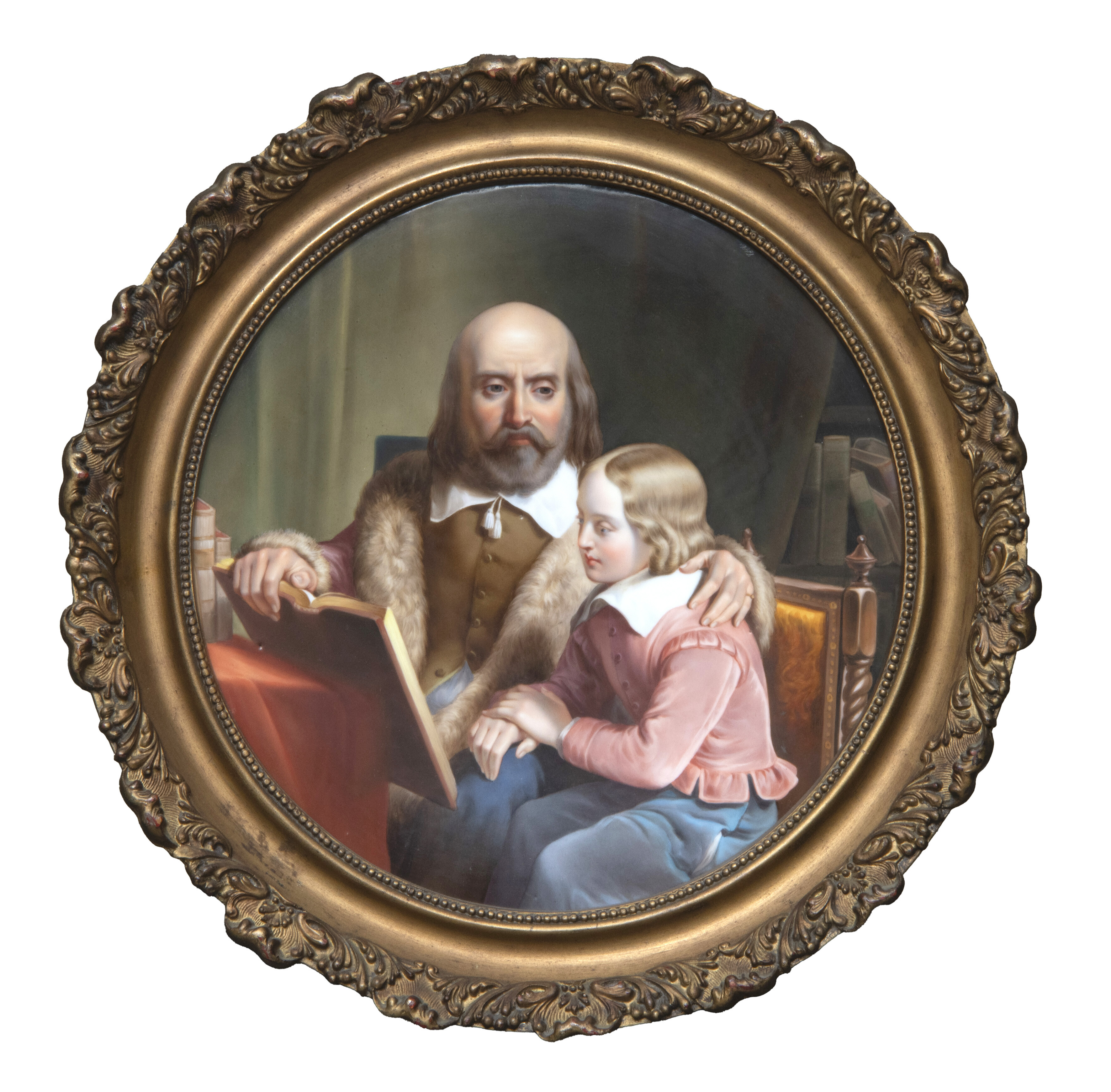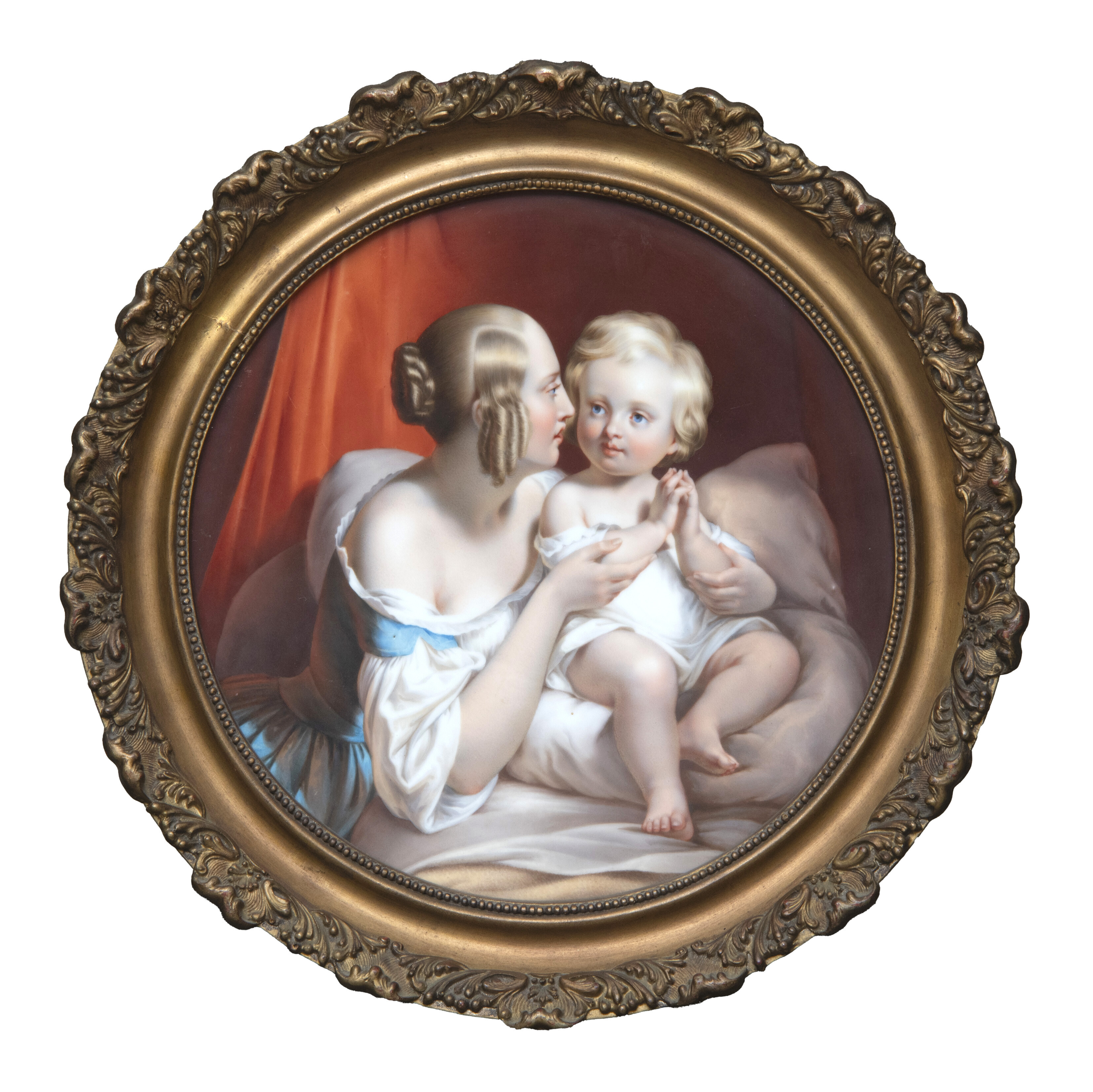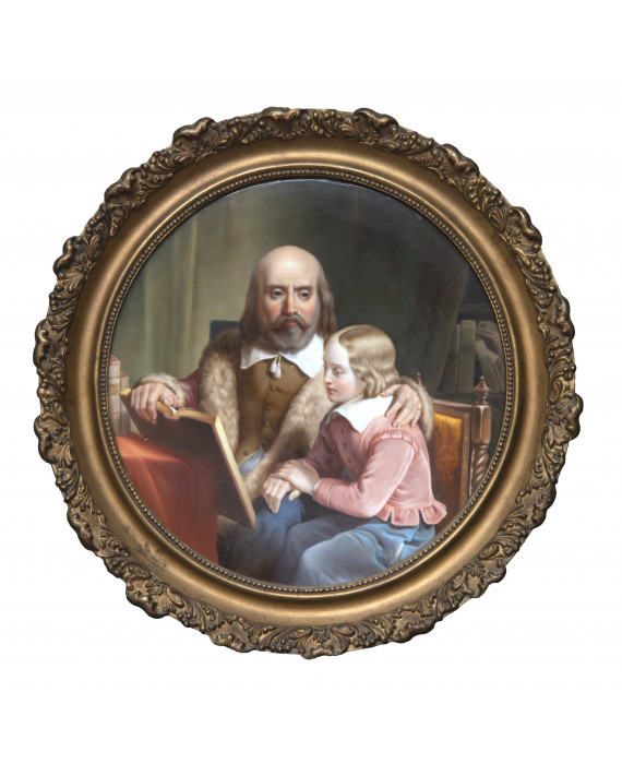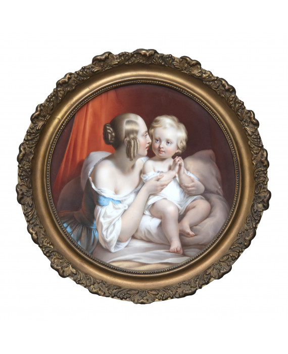 PITTORE FRANCESE, XIX SECOLO AMORE MATERNO L'INSEGNANTE Coppia di dipinti circolari su porcellana, diametro cm. 29 Cornici in legno e stucchi dorati