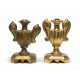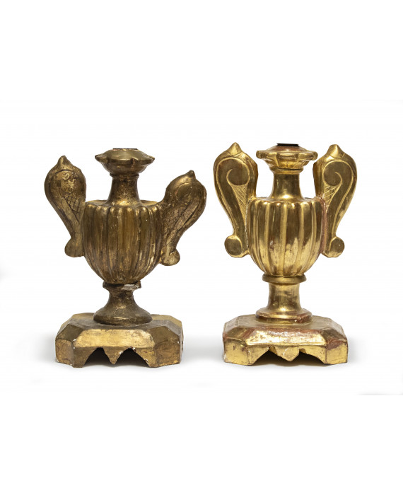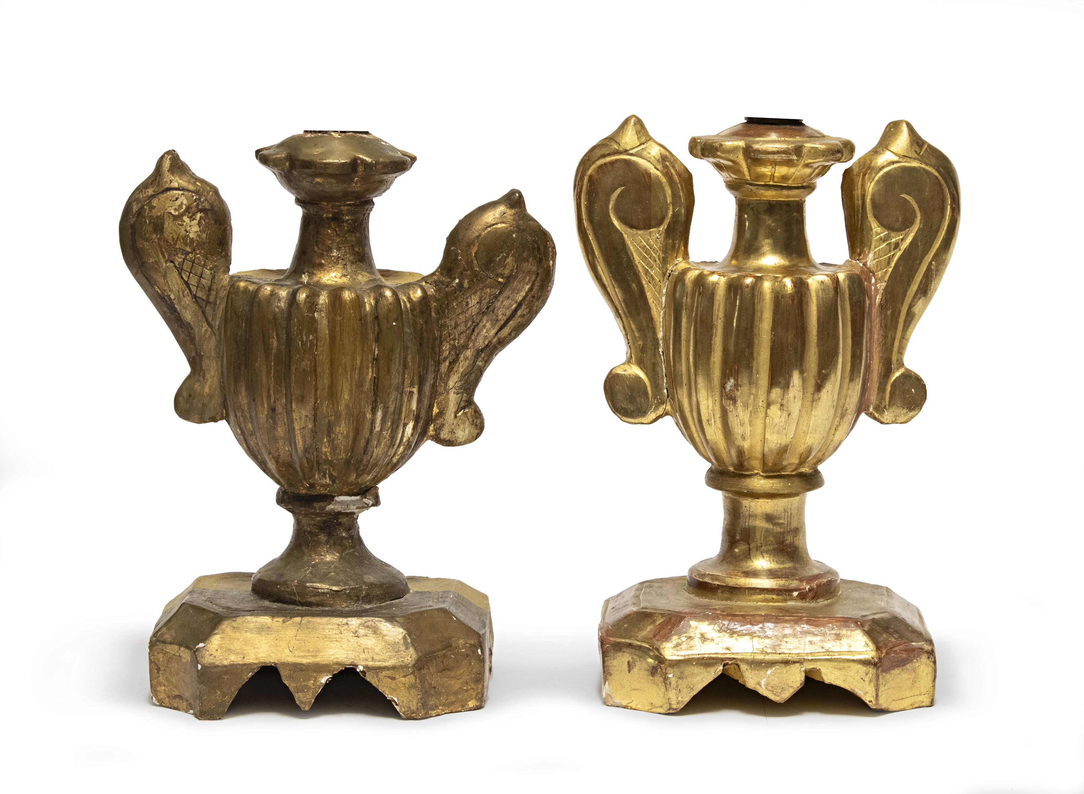 COPPIA DI PORTA PALME IN LEGNO DORATO, XVIII SECOLO con corpo baccellato e anse a chiave musicale. Adattati a lumi. Difetti. Misure cm. 30 x 22 x 15.