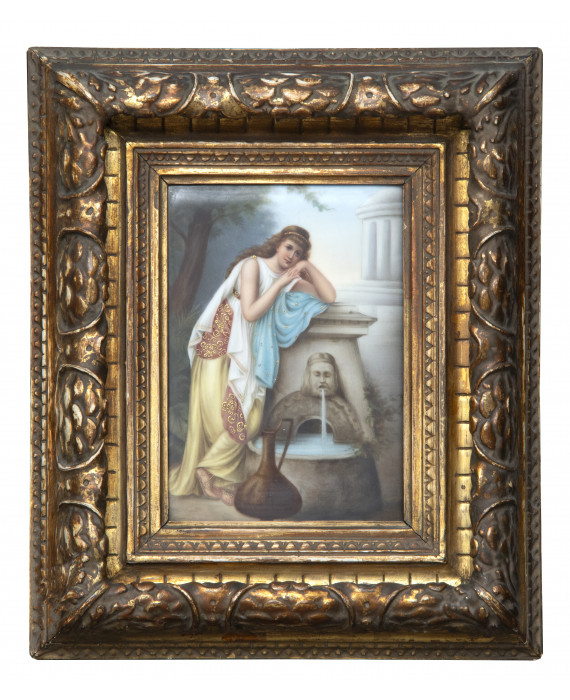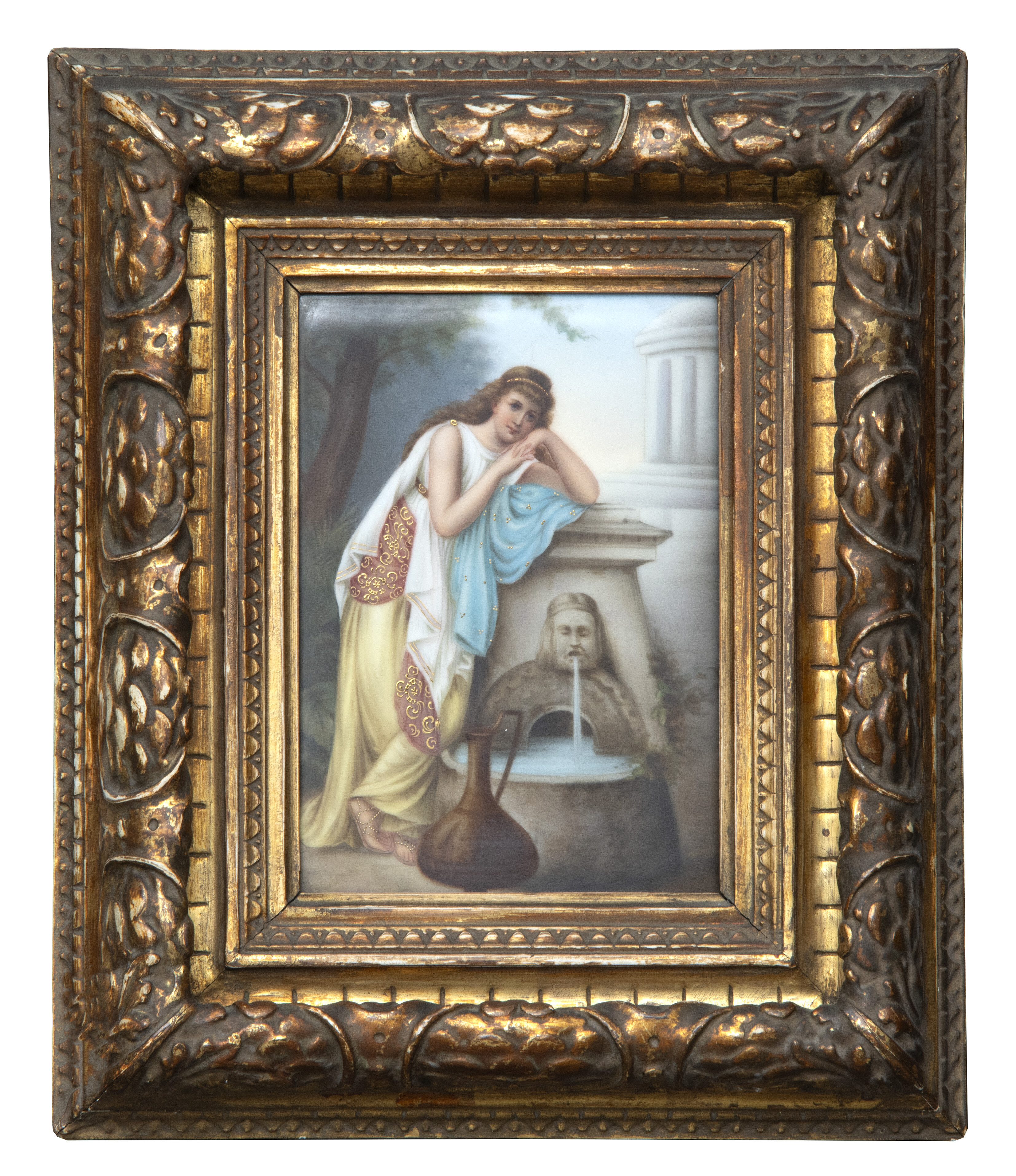 PITTORE FRANCESE, XIX SECOLO DONNA ALLA FONTANA Dipinto su porcellana, cm. 17,5 x 12 Titolato al retro CORNICE Cornice in legno dorato a guantiera con decori fogliacei, del XIX secolo