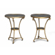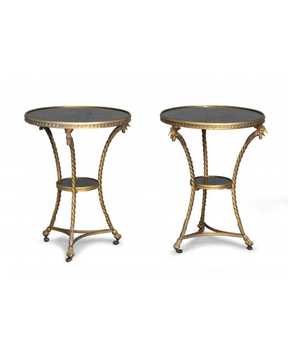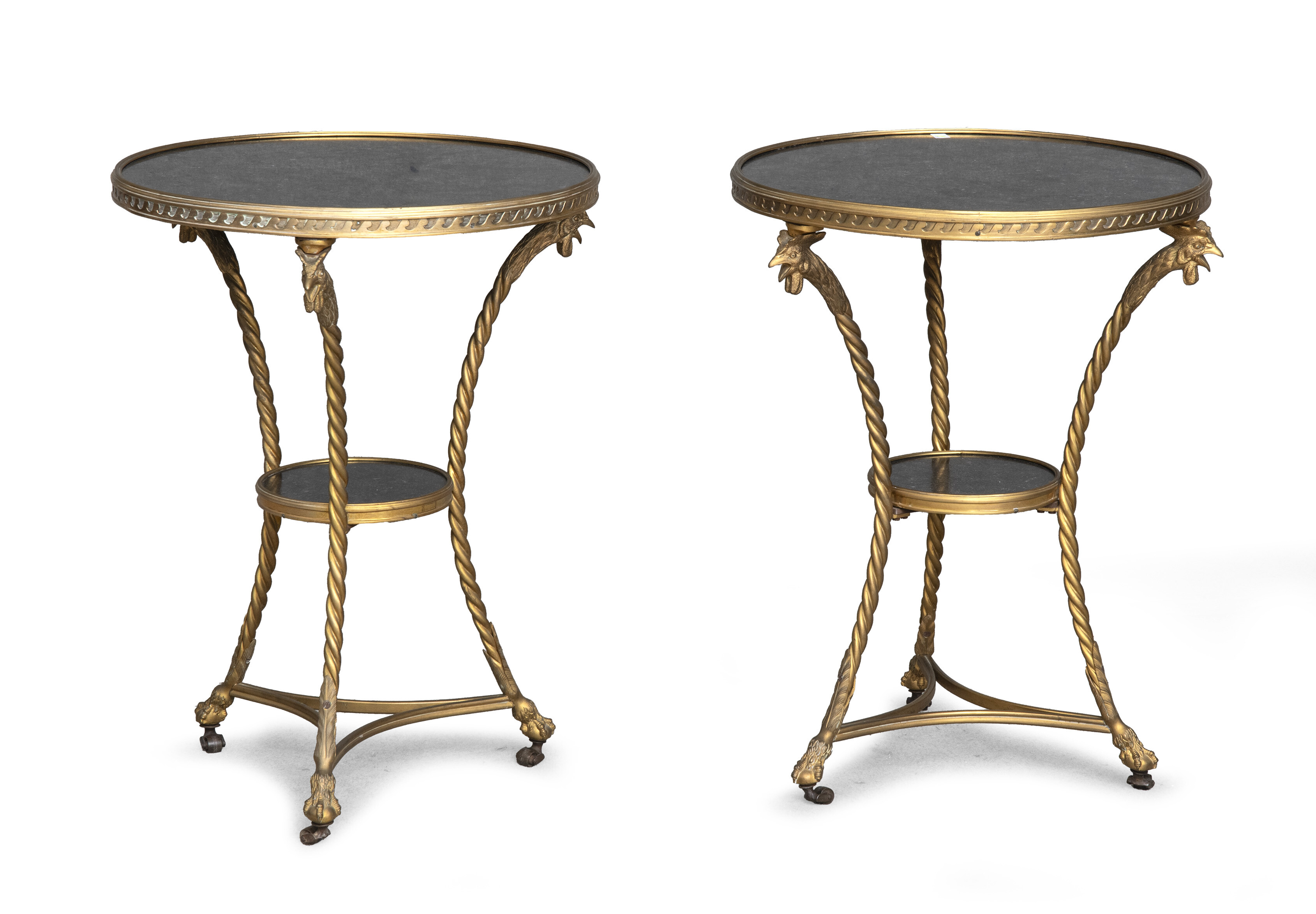 RARA COPPIA DI TAVOLINI, INIZI XIX SECOLO con piano circolare in porfido nero e fusto in bronzo dorato con bordo del piano cesellato a ondine. Montanti a cordone tortile con apici a teste di grifoni e desinenze aquiline. Pianetto inferiore anch'esso in porfido nero. Misure cm. 70 x 55. PROVENIENZA Famiglia romana