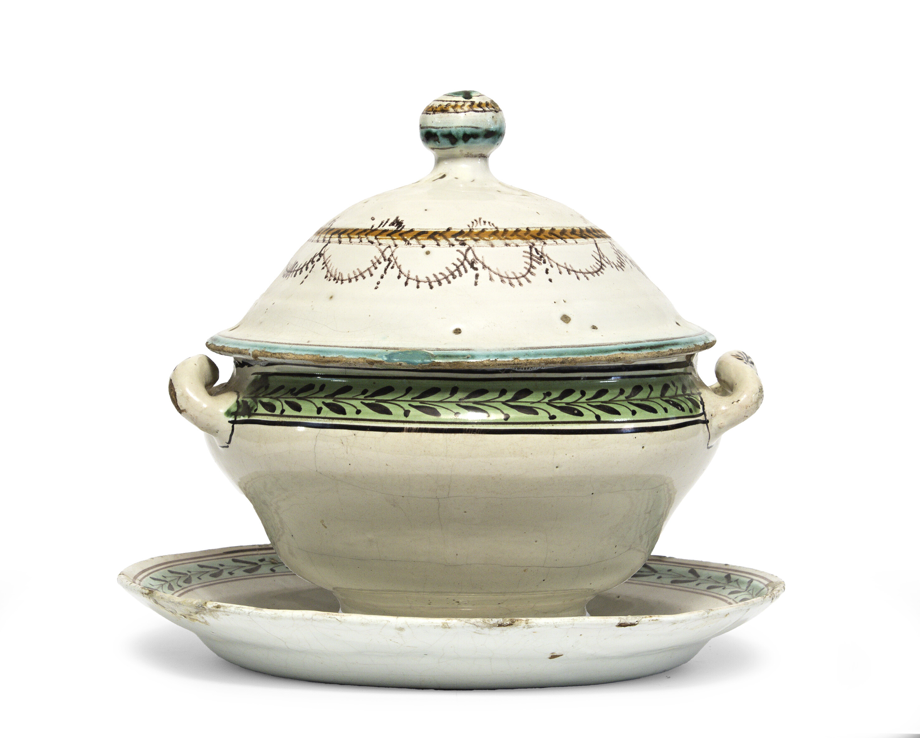 ZUPPIERA MAIOLICA XIX SECOLO Zuppiera in maiolica policroma, completa di piatto, decorata a festoni e motivi floreali. Difetti di cottura. Italia centrale, XIX secolo. Misure cm. Alzata cm 26, piatto diametro cm. 30.