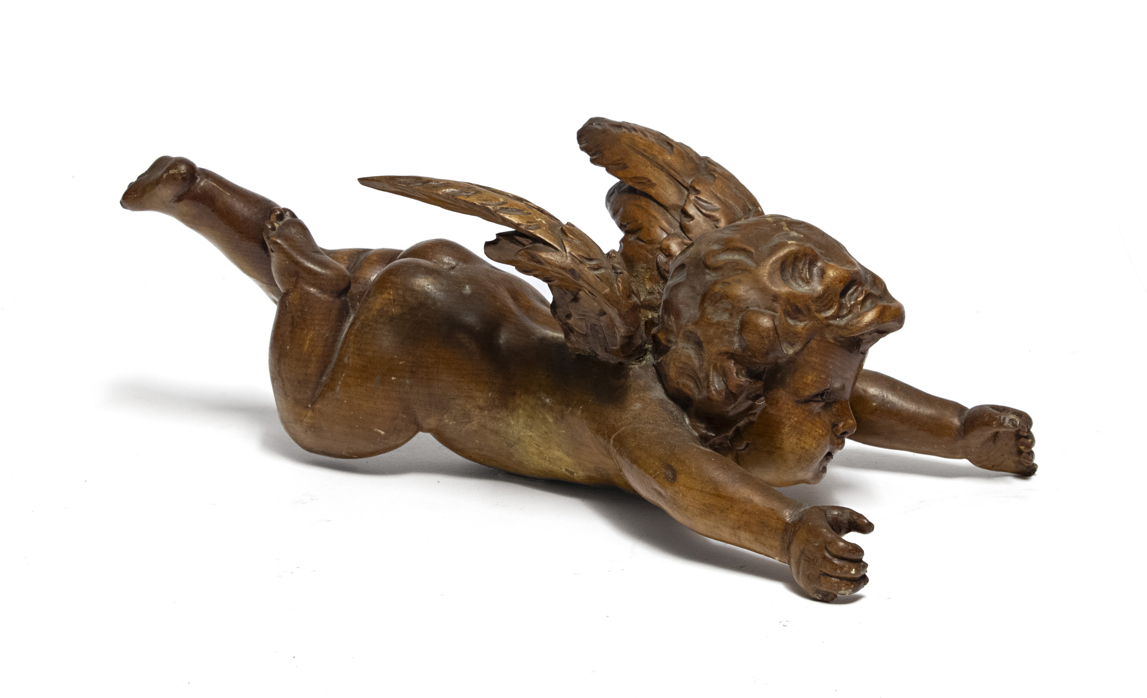 Free bidSCULTURA IN LEGNO DI BOSSO, XIX SECOLO raffigurante un amorino in posa volante. Misure cm. 15 x 17 x 30. Dita mancanti.