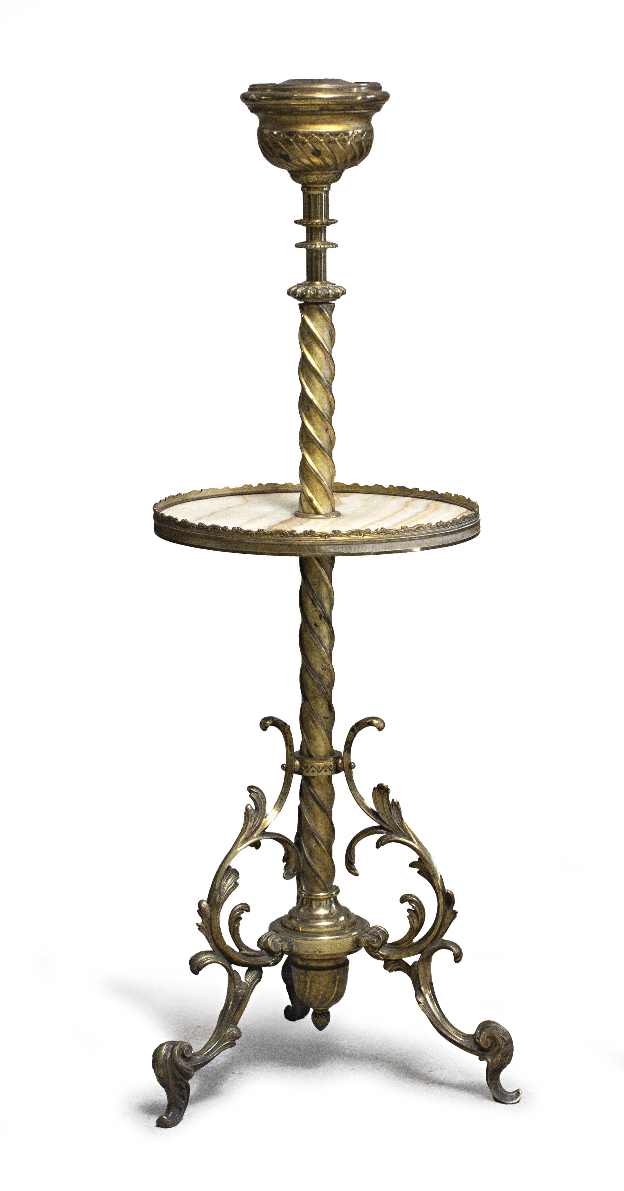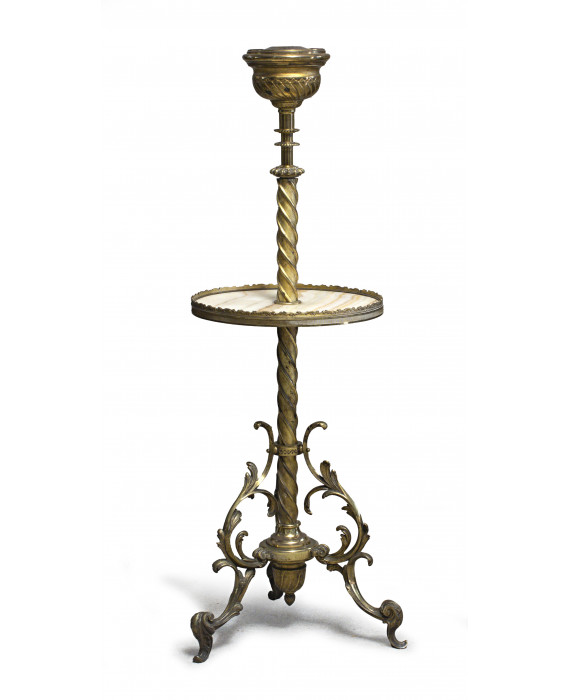 LUME DA TERRA IN OTTONE, INIZI XX SECOLO a fusto tortile con ripiano in alabastro. Tre piedi a doppia voluta, con finale a foglie. Elettrificato. Misure cm. 133 x 41.