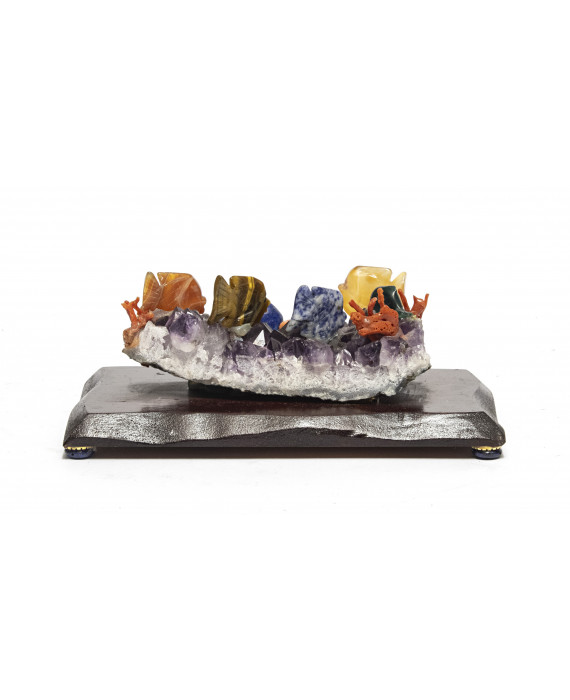 Free bidCOMPOSIZIONE CON AMETISTA, CINA XX SECOLO raffigurante fondo marino con elementi in pietre dure. Base in legno. Misure cm. 8 x 16 x 8.