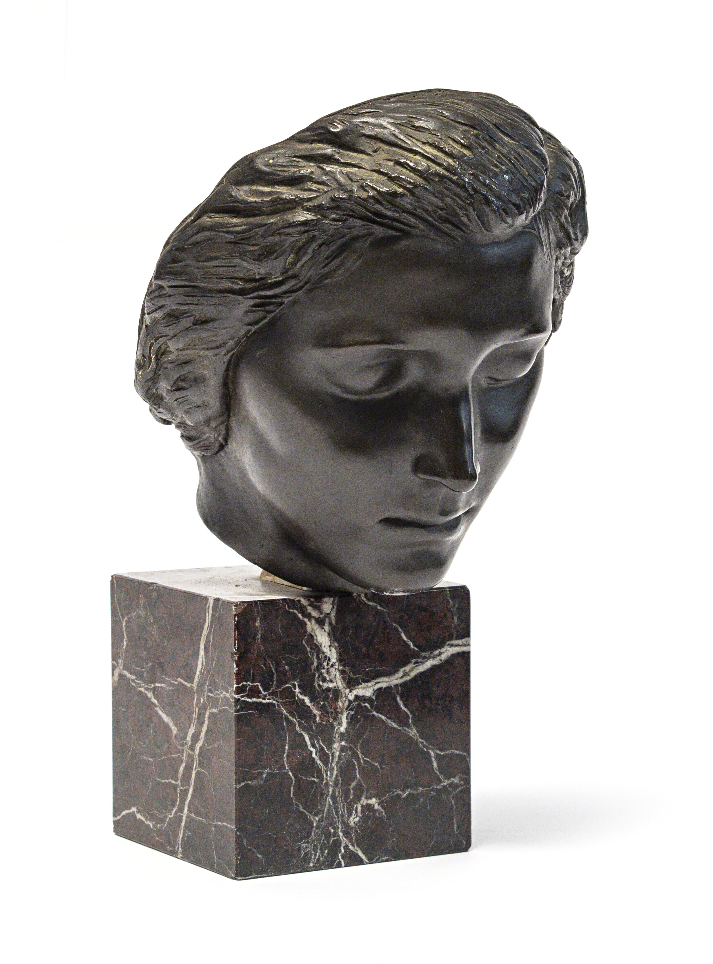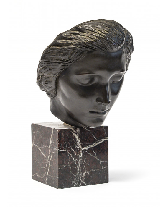 ALFREDO BIAGINI (Roma 1886 - 1952) Volto, anni '20 Bronzo a cera persa, cm. 25 x 20 x 20 Firma incisa alla base del collo sinistro Basetta in marmo fior di pesco