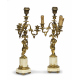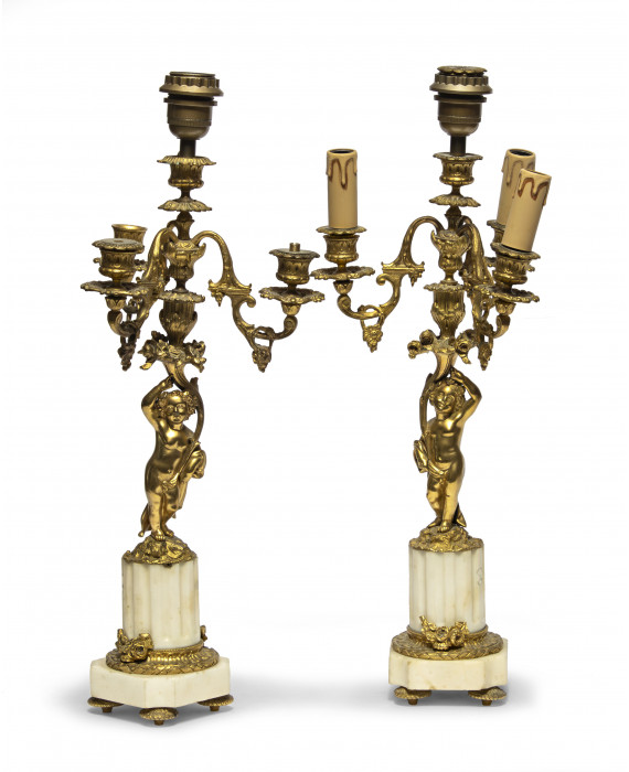 COPPIA DI CANDELABRI IN BRONZO DORATO, INIZI XIX SECOLO a quattro fiamme con braccia a ramages, sostenute da fusto a figura di putto. Base in marmo bianco a rocchio di colonna, con applicazioni a ghirlanda e fiori. Misure cm. 50 x 24.
