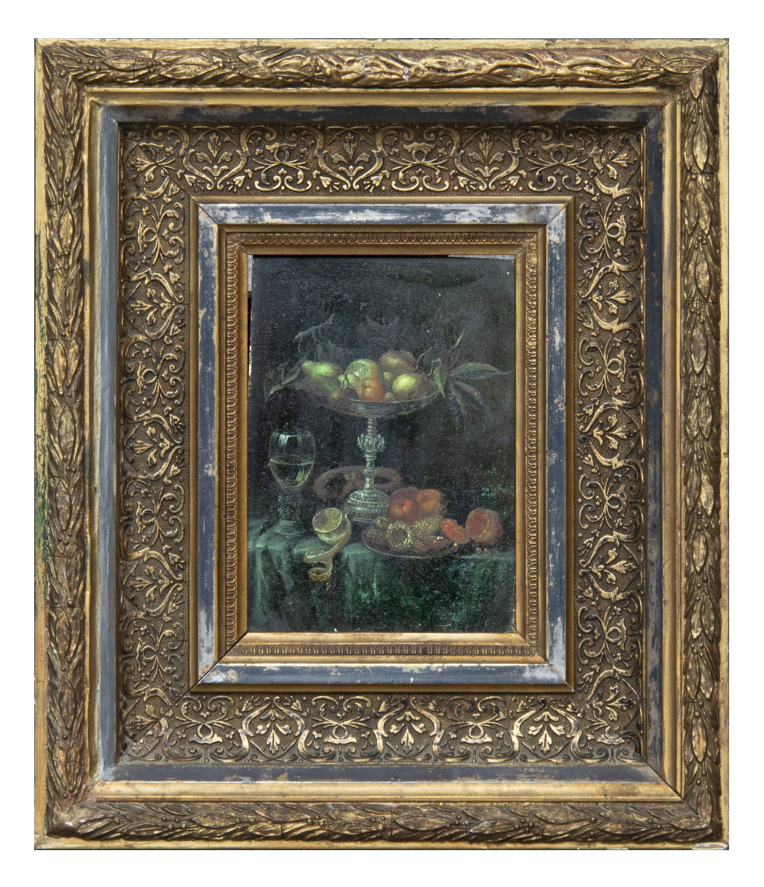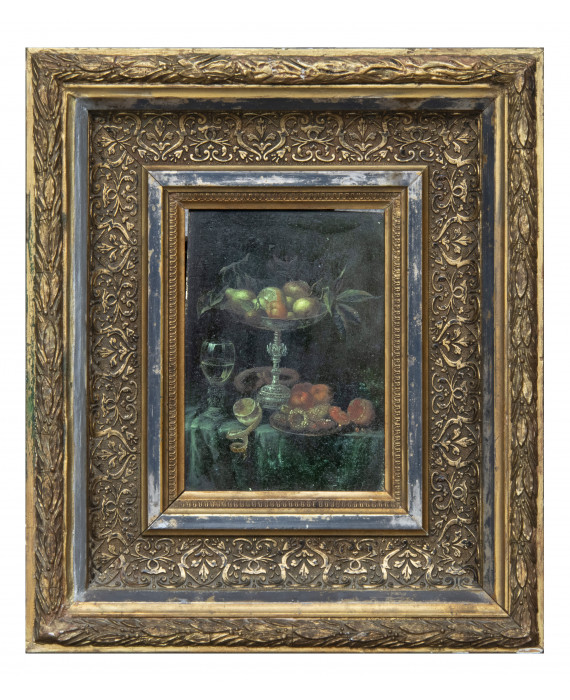 Free bidPITTORE ACCADEMICO, XX SECOLO TAVOLA CON ALZATA, BICCHIERE E NATURA MORTA DI FRUTTA Olio su tavola, cm. 18 x 13 Cornice in legno e stucchi dorati Firma poco leggibile in basso a destra