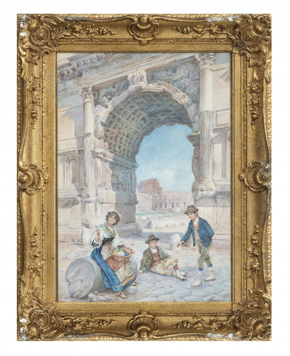 ETTORE ASCENZI (Arrivo a Roma 1870/1908) POPOLANI ALL'ARCO DI TITO Acquerello, cm. 55 x 37 Firmato in basso a destra Cornice dorata