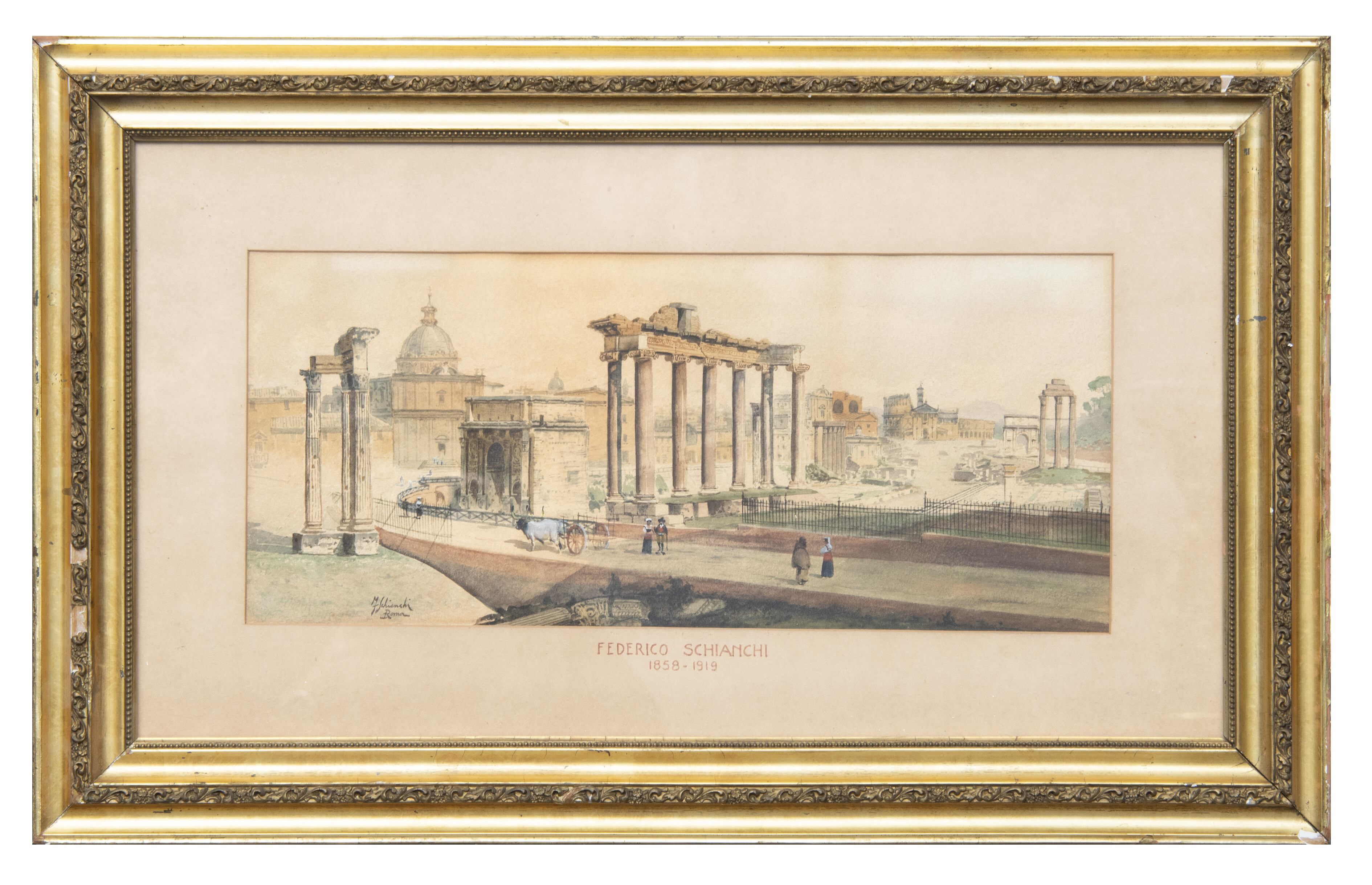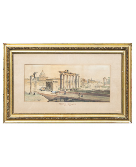 FEDERICO SCHIANCHI (Modena 1858 - Roma 1918) FORO ROMANO Acquerello su carta, cm. 19 x 43 Firmato e situato Roma, in basso a sinistra In cornice