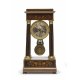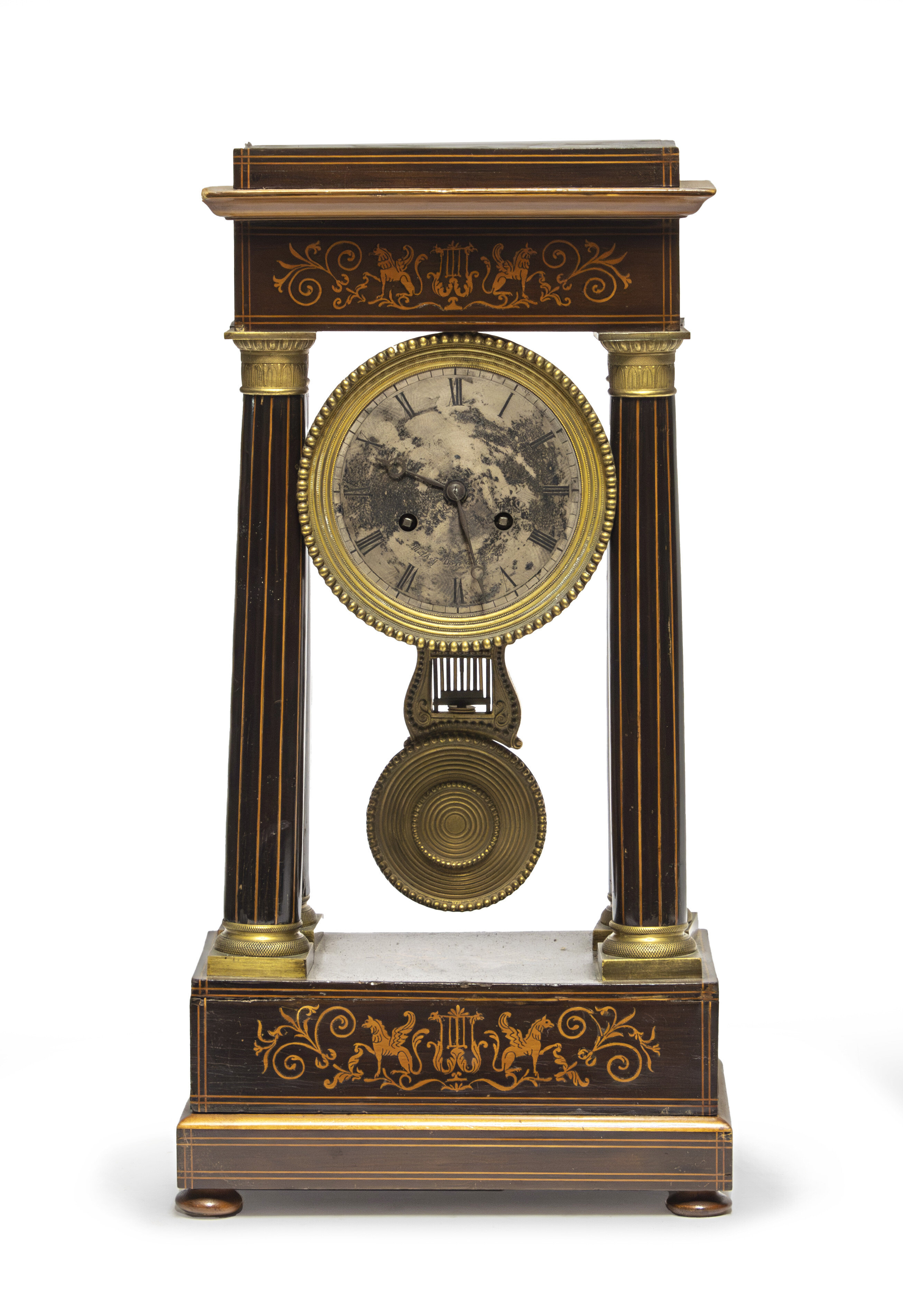 OROLOGIO A TEMPIO IN PALISSANDRO, XIX SECOLO con intarsi neoclassici in legno di bosso. Finiture in bronzo dorato. Misure cm. 50 x 26 x 15.