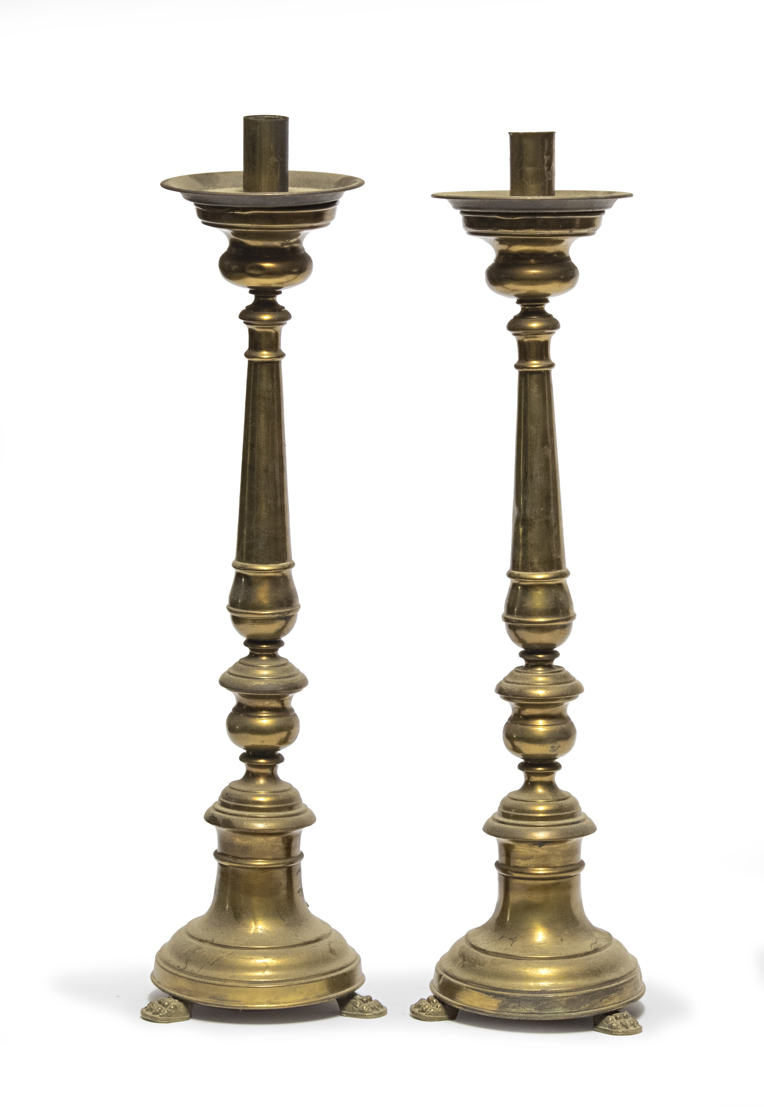 COPPIA DI CANDELIERI IN OTTONE, XIX SECOLO con fusto ad anelli e piedi ferini. Misure cm. 50 x 20.