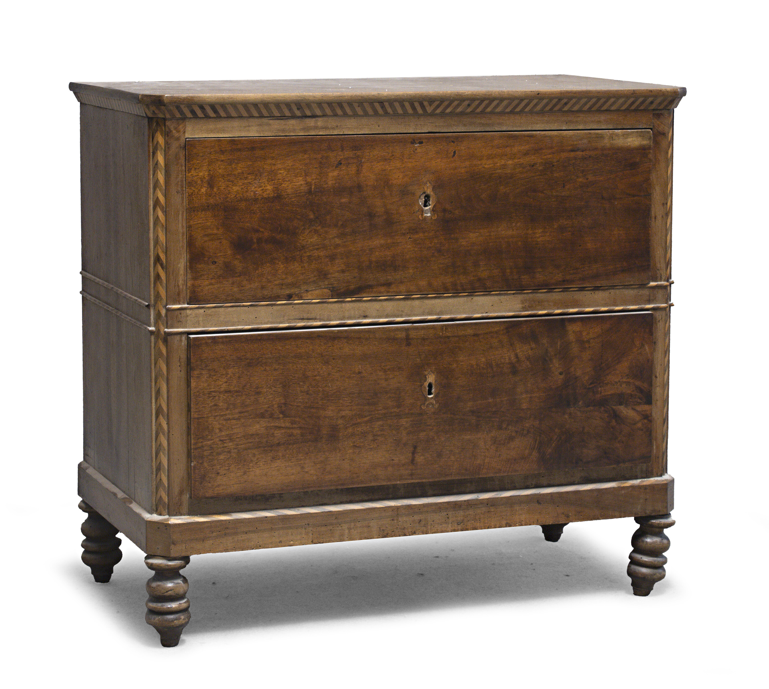PICCOLO COMÒ IN NOCE, ITALIA MERIDIONALE XIX SECOLO con fascia e angoli intarsi a spina di pesce. Due cassetti sul fronte, piedi a dischi. Misure cm. 96 x 103 x 52.