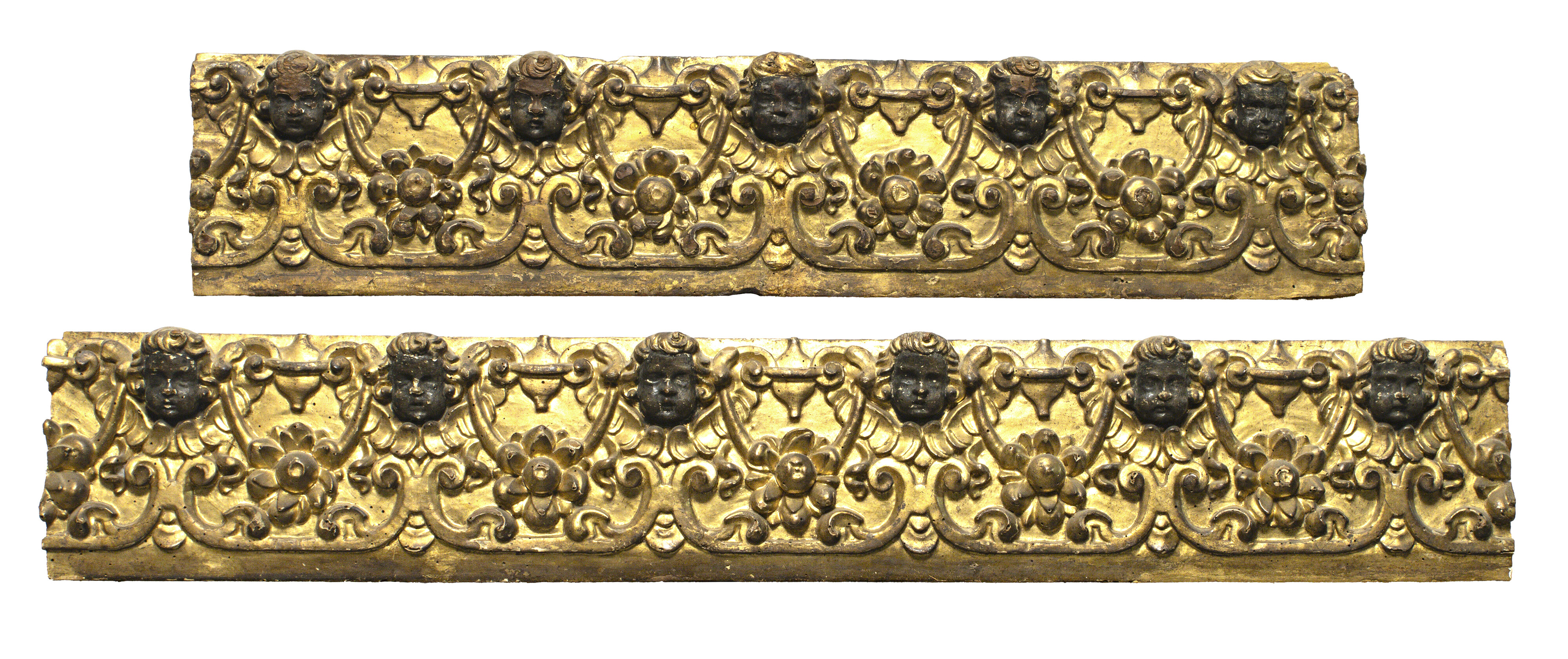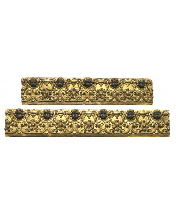 DUE FREGI IN LEGNO dorato e intagliato con teste di putti laccate in nero e motivi floreali. Fine XVI secolo Misure cm. 22 x 130 e cm.22 x 105.