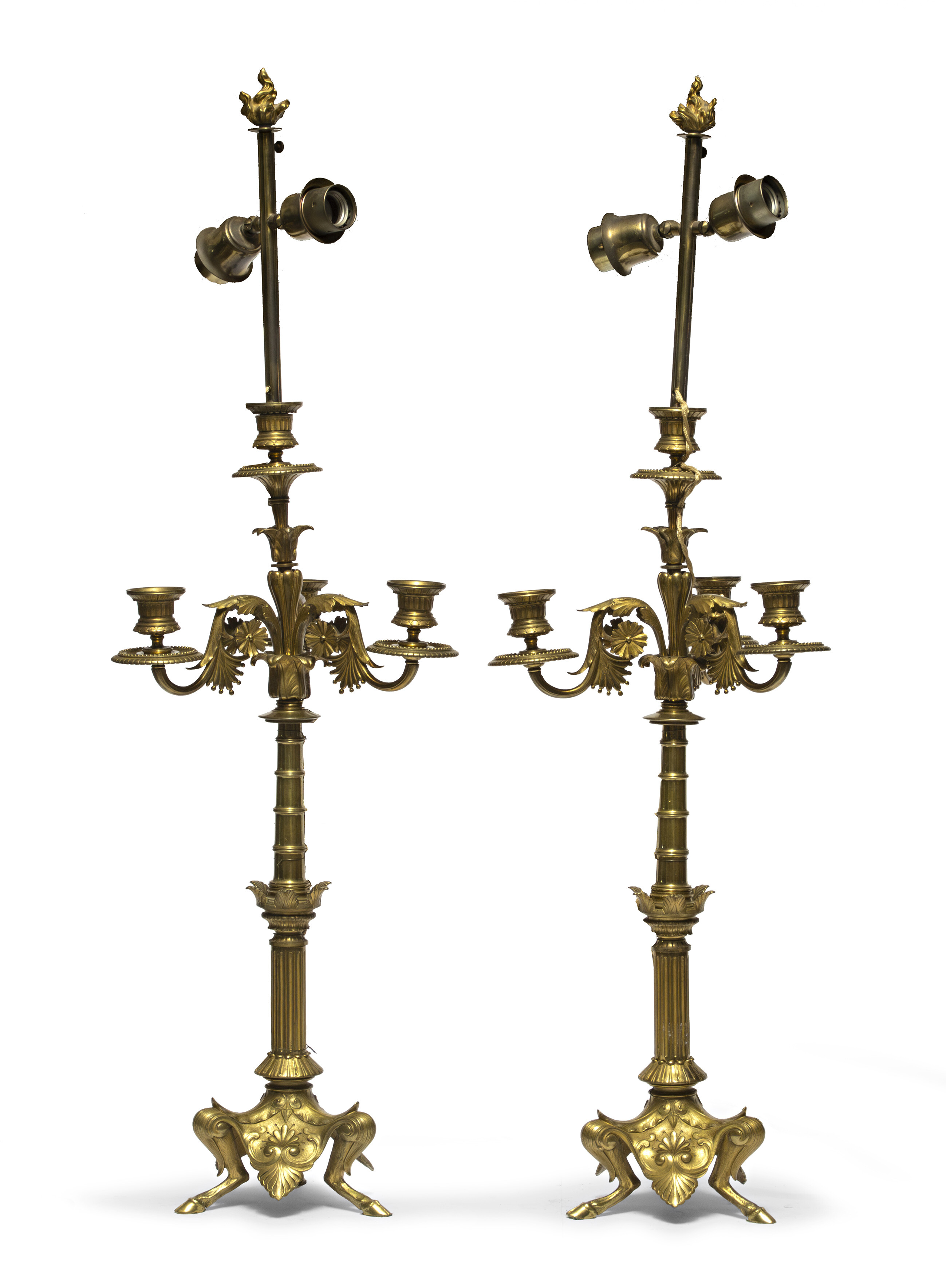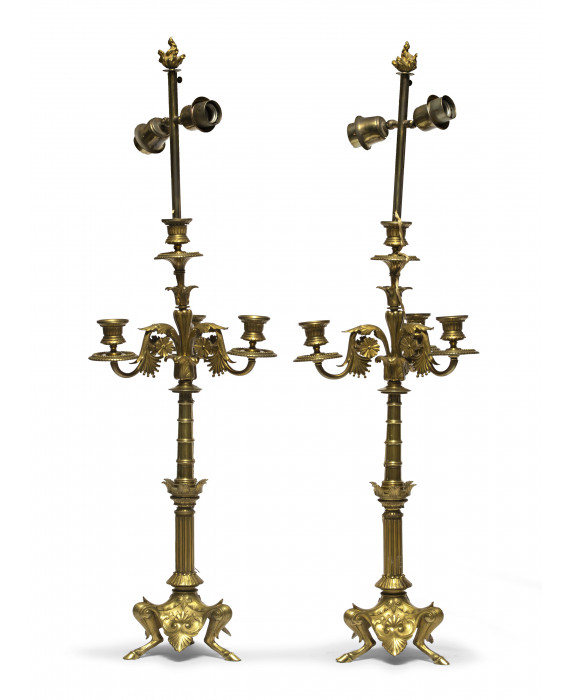 SPLENDIDA COPPIA DI CANDELABRI IN BRONZO, INIZI XIX SECOLO a quattro fiamme con braccia cesellate a ramages. Fusto a canna di bambù, base a colonna con piedi caprini animati. Adattati a lumi. Misure candelabro cm. 68 x 28. PROVENIENZA Famiglia romana