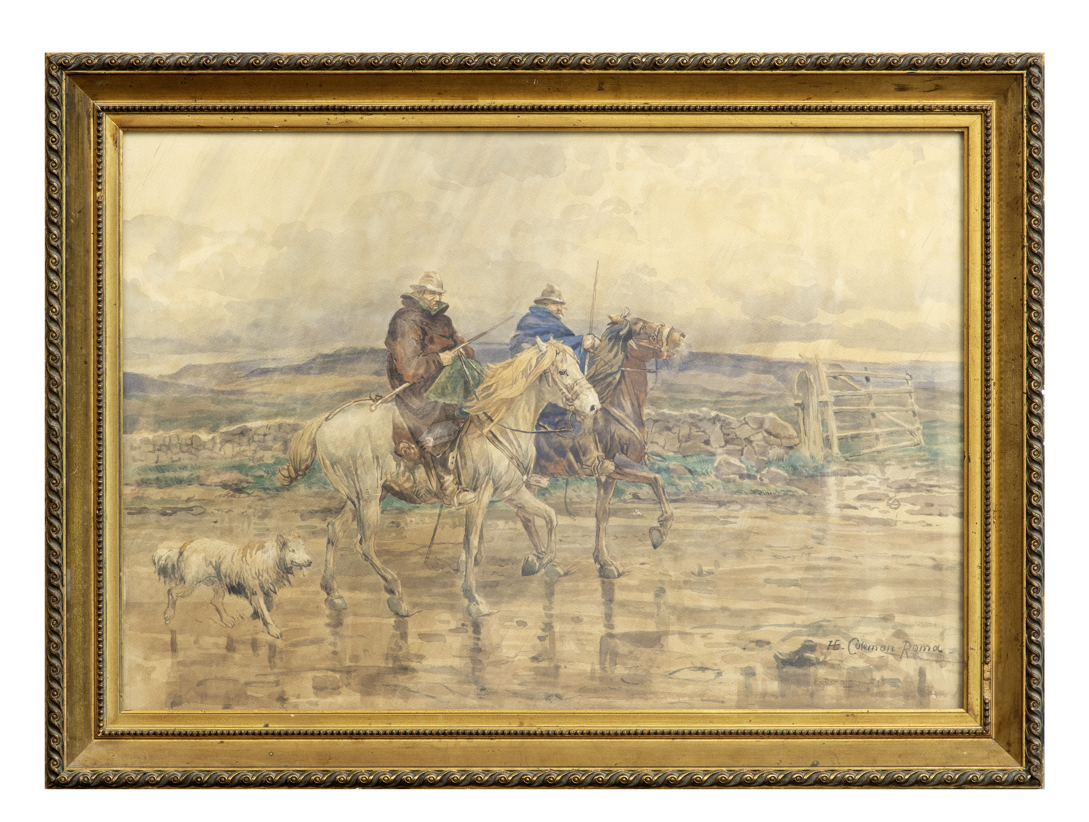 ENRICO COLEMAN (Roma 1846 - 1911) BUTTERI NELLA CAMPAGNA ROMANA Acquerello, cm. 42 x 58 Firmato in basso a destra Cornice dorata