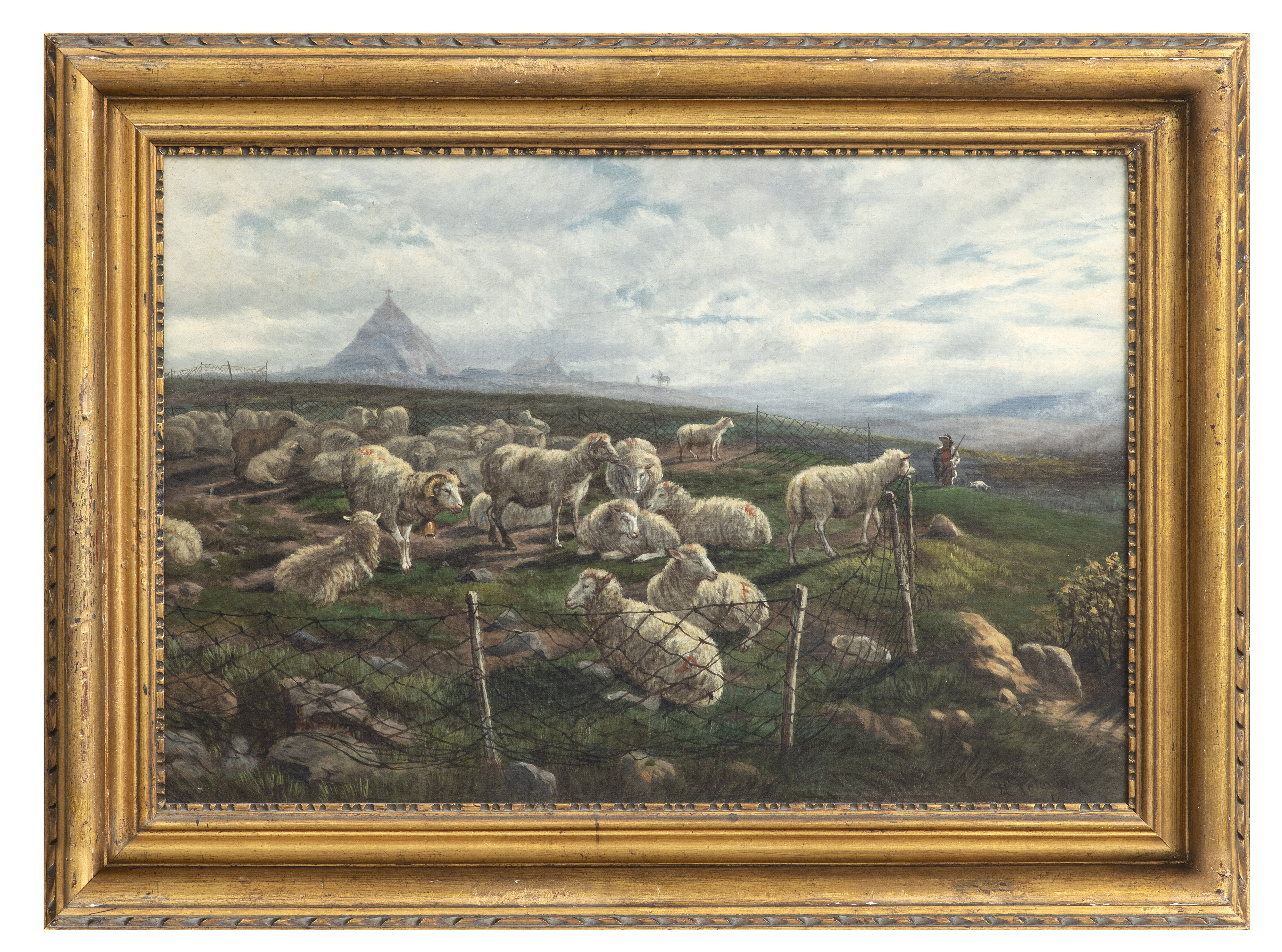 ENRICO COLEMAN (Roma 1846 - 1911) GREGGE NELLA CAMPAGNA ROMANA Olio su tela, cm. 36 x 55 Firmato e situato Roma, in basso a destra Cornice dorata