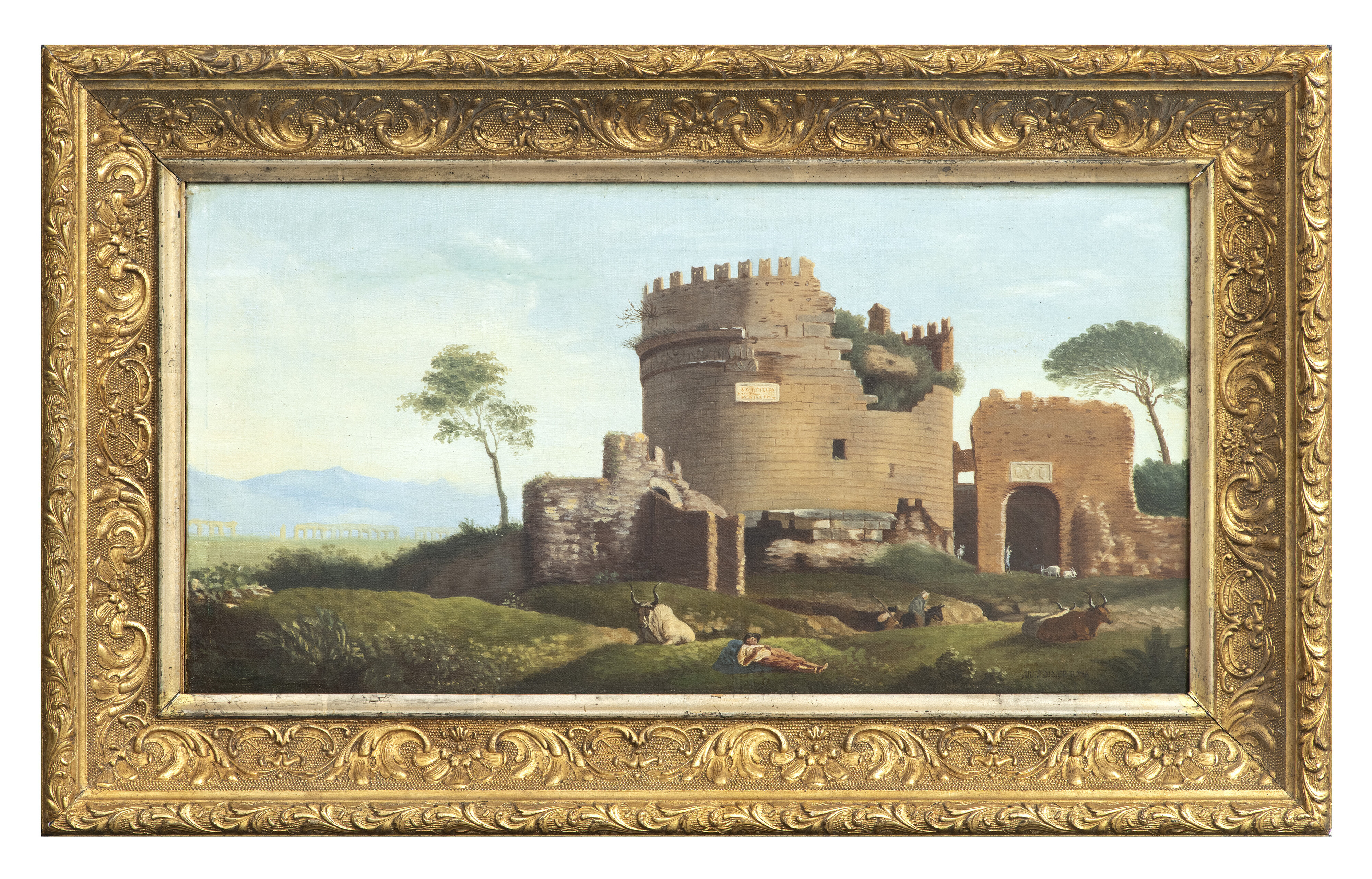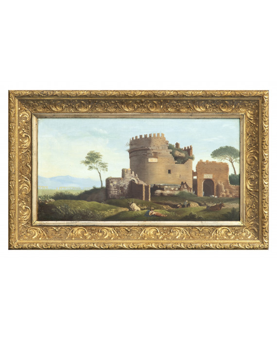 PITTORE ROMANO, XIX SECOLO TOMBA DI CECILIA METELLA CON PASTORI Olio su tela, cm. 30 x 62 Non firmato Cornice dorata